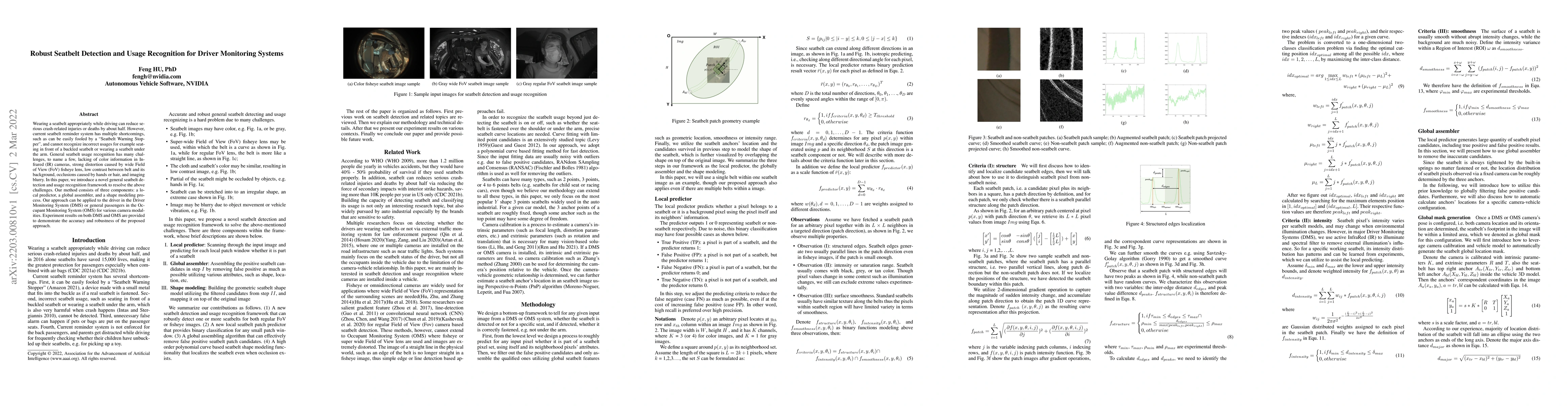 This paper proposes a novel framework for robust seatbelt detection and usage recognition in driver monitoring systems, addressing challenges like lack of color information, camera distortion, and occlusions. The method includes a local predictor, global assembler, and shape modeling, demonstrating accuracy and robustness through experiments on both driver and occupant monitoring systems.