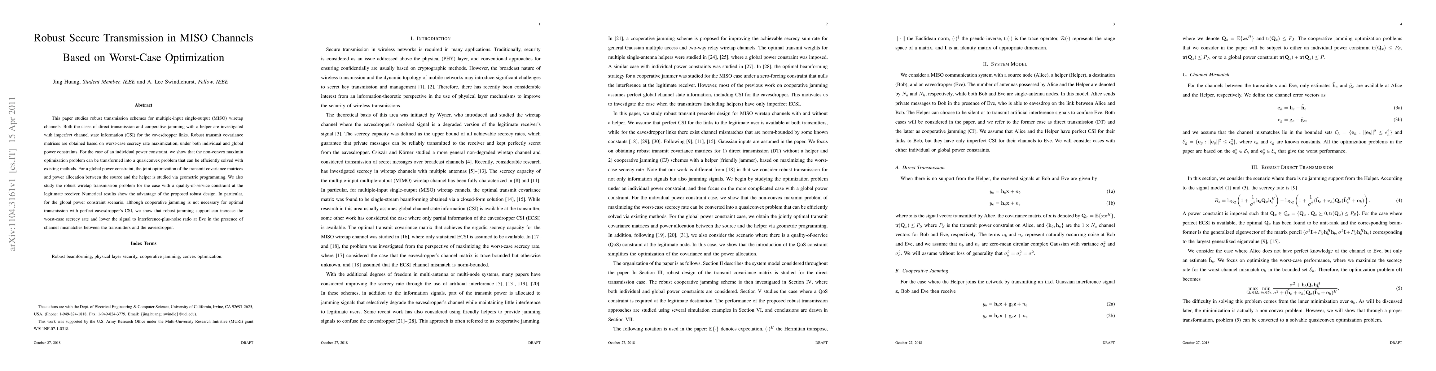 This paper proposes robust transmission schemes for MISO wiretap channels under imperfect eavesdropper channel state information, optimizing secrecy rate via worst-case optimization. It investigates both direct transmission and cooperative jamming, demonstrating efficient solutions under individual and global power constraints, and showing improved performance with robust jamming support despite channel mismatches.