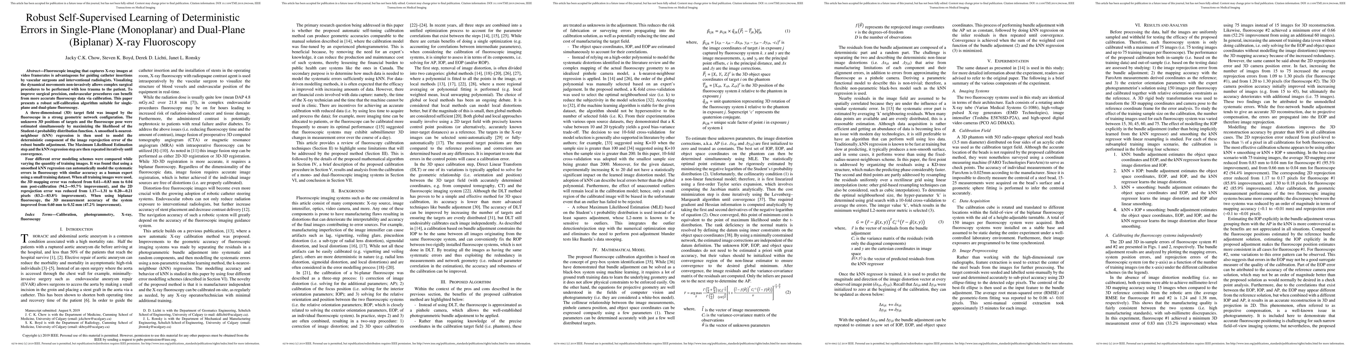 Fluoroscopic imaging that captures X-ray images at video framerates is advantageous for guiding catheter insertions by vascular surgeons and interventional radiologists. Visualizing the dynamical movements non-invasively allows complex surgical procedures to be performed with less trauma to the patient. To improve surgical precision, endovascular procedures can benefit from more accurate fluoroscopy data via calibration. This paper presents a robust self-calibration algorithm suitable for single-plane and dual-plane fluoroscopy. A three-dimensional (3D) target field was imaged by the fluoroscope in a strong geometric network configuration. The unknown 3D positions of targets and the fluoroscope pose were estimated simultaneously by maximizing the likelihood of the Student-t probability distribution function. A smoothed k-nearest neighbour (kNN) regression is then used to model the deterministic component of the image reprojection error of the robust bundle adjustment. The Maximum Likelihood Estimation step and the kNN regression step are then repeated iteratively until convergence. Four different error modeling schemes were compared while varying the quantity of training images. It was found that using a smoothed kNN regression can automatically model the systematic errors in fluoroscopy with similar accuracy as a human expert using a small training dataset. When all training images were used, the 3D mapping error was reduced from 0.61-0.83 mm to 0.04 mm post-calibration (94.2-95.7% improvement), and the 2D reprojection error was reduced from 1.17-1.31 to 0.20-0.21 pixels (83.2-83.8% improvement). When using biplanar fluoroscopy, the 3D measurement accuracy of the system improved from 0.60 mm to 0.32 mm (47.2% improvement).