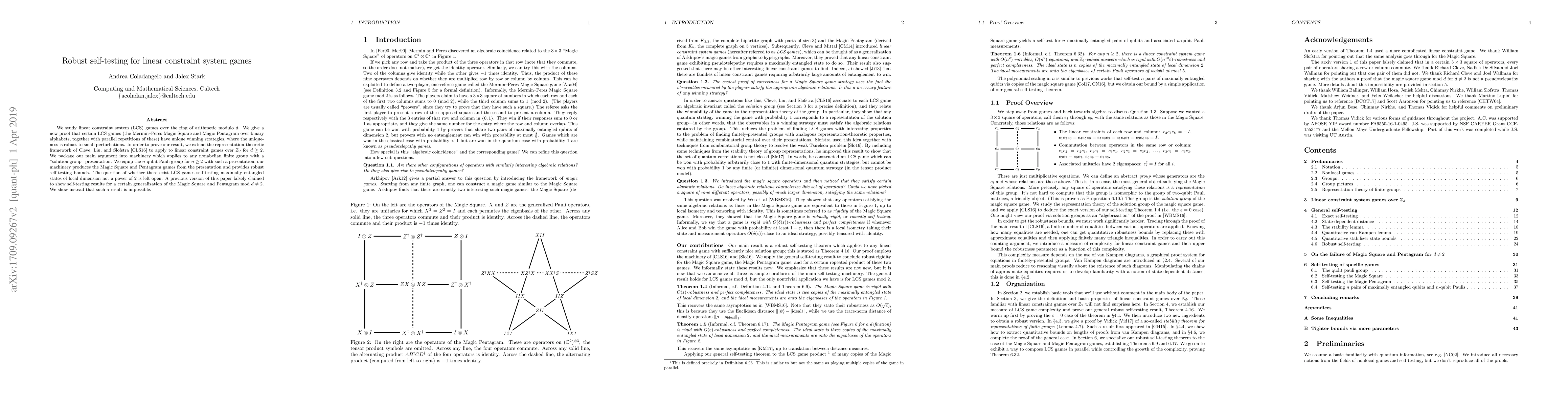 We study linear constraint system (LCS) games over the ring of arithmetic modulo $d$. We give a new proof that certain LCS games (the Mermin--Peres Magic Square and Magic Pentagram over binary alphabets, together with parallel repetitions of these) have unique winning strategies, where the uniqueness is robust to small perturbations. In order to prove our result, we extend the representation-theoretic framework of Cleve, Liu, and Slofstra (Journal of Mathematical Physics 58.1 (2017): 012202.) to apply to linear constraint games over $\mathbb{Z}_d$ for $d\geq 2$. We package our main argument into machinery which applies to any nonabelian finite group with a ''solution group'' presentation. We equip the $n$-qubit Pauli group for $n\geq 2$ with such a presentation; our machinery produces the Magic Square and Pentagram games from the presentation and provides robust self-testing bounds. The question of whether there exist LCS games self-testing maximally entangled states of local dimension not a power of $2$ is left open. A previous version of this paper falsely claimed to show self-testing results for a certain generalization of the Magic Square and Pentagram mod $d\neq 2$. We show instead that such a result is impossible.