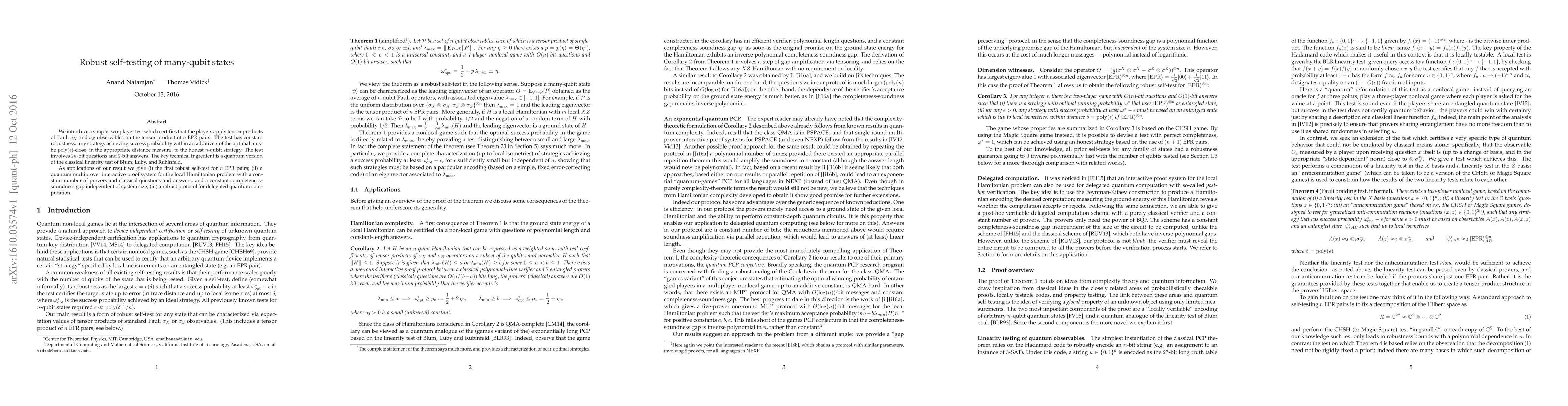 We introduce a simple two-player test which certifies that the players apply tensor products of Pauli $\sigma_X$ and $\sigma_Z$ observables on the tensor product of $n$ EPR pairs. The test has constant robustness: any strategy achieving success probability within an additive $\varepsilon$ of the optimal must be $\mathrm{poly}(\varepsilon)$-close, in the appropriate distance measure, to the honest $n$-qubit strategy. The test involves $2n$-bit questions and $2$-bit answers. The key technical ingredient is a quantum version of the classical linearity test of Blum, Luby, and Rubinfeld. As applications of our result we give (i) the first robust self-test for $n$ EPR pairs; (ii) a quantum multiprover interactive proof system for the local Hamiltonian problem with a constant number of provers and classical questions and answers, and a constant completeness-soundness gap independent of system size; (iii) a robust protocol for delegated quantum computation.