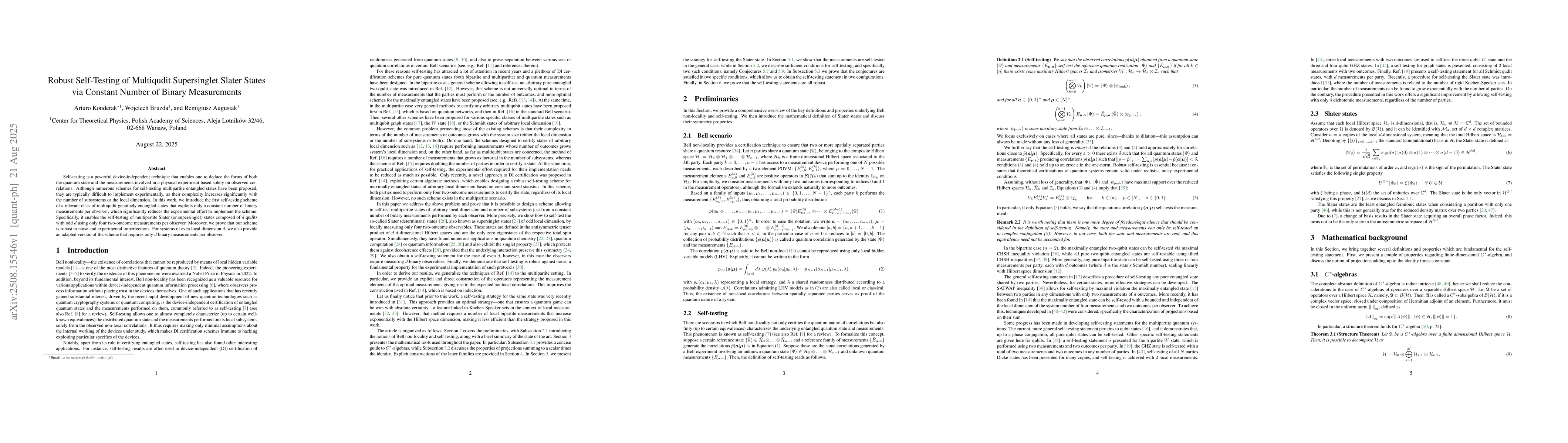 Self-testing is a powerful device-independent technique that enables one to deduce the forms of both the quantum state and the measurements involved in a physical experiment based solely on observed correlations. Although numerous schemes for self-testing multipartite entangled states have been proposed, they are typically difficult to implement experimentally, as their complexity increases significantly with the number of subsystems or the local dimension. In this work, we introduce the first self-testing scheme of a relevant class of multiqudit genuinely entangled states that exploits only a constant number of binary measurements per observer, which significantly reduces the experimental effort to implement the scheme. Specifically, it enables the self-testing of multipartite Slater (or supersinglet) states composed of $d$ qu\textit{d}its with odd $d$ using only four two-outcome measurements per observer. Moreover, we prove that our scheme is robust to noise and experimental imperfections. For systems of even local dimension $d$, we also provide an adapted version of the scheme that requires only $d$ binary measurements per observer.