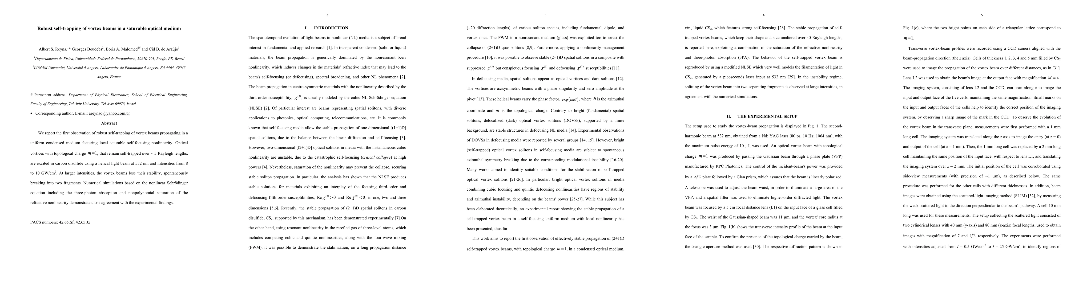 This paper reports the first observation of robust self-trapping of vortex beams in a saturable optical medium, demonstrating stability over ~5 Rayleigh lengths in carbon disulfide. At higher intensities, vortex beams break into fragments, with numerical simulations supporting the experimental results.