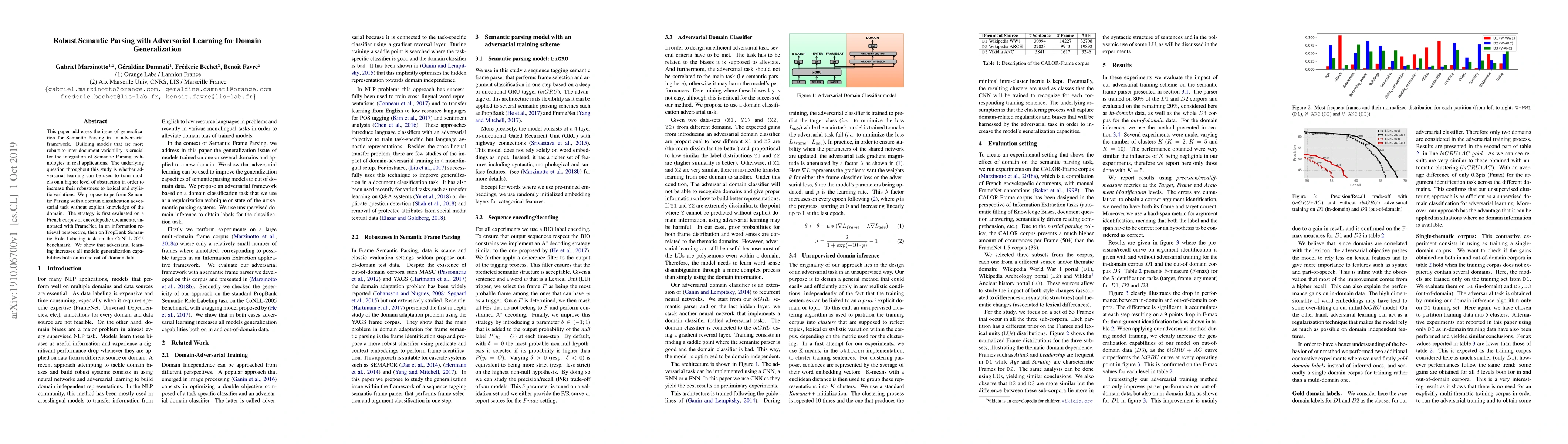 This paper addresses the issue of generalization for Semantic Parsing in an adversarial framework. Building models that are more robust to inter-document variability is crucial for the integration of Semantic Parsing technologies in real applications. The underlying question throughout this study is whether adversarial learning can be used to train models on a higher level of abstraction in order to increase their robustness to lexical and stylistic variations.We propose to perform Semantic Parsing with a domain classification adversarial task without explicit knowledge of the domain. The strategy is first evaluated on a French corpus of encyclopedic documents, annotated with FrameNet, in an information retrieval perspective, then on PropBank Semantic Role Labeling task on the CoNLL-2005 benchmark. We show that adversarial learning increases all models generalization capabilities both on in and out-of-domain data.