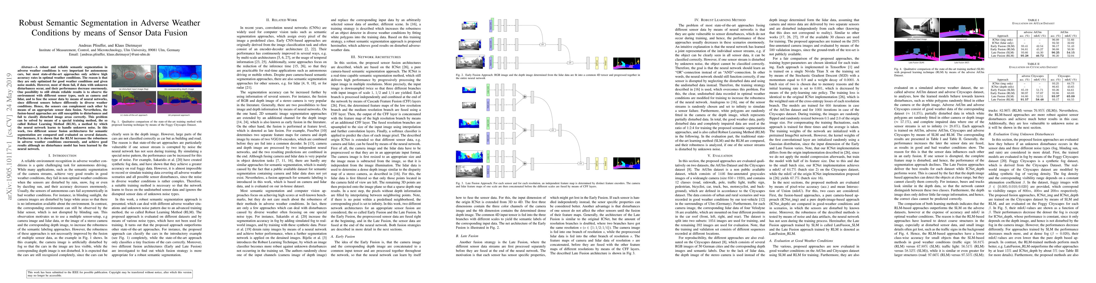A robust and reliable semantic segmentation in adverse weather conditions is very important for autonomous cars, but most state-of-the-art approaches only achieve high accuracy rates in optimal weather conditions. The reason is that they are only optimized for good weather conditions and given noise models. However, most of them fail, if data with unknown disturbances occur, and their performance decrease enormously. One possibility to still obtain reliable results is to observe the environment with different sensor types, such as camera and lidar, and to fuse the sensor data by means of neural networks, since different sensors behave differently in diverse weather conditions. Hence, the sensors can complement each other by means of an appropriate sensor data fusion. Nevertheless, the fusion-based approaches are still susceptible to disturbances and fail to classify disturbed image areas correctly. This problem can be solved by means of a special training method, the so called Robust Learning Method (RLM), a method by which the neural network learns to handle unknown noise. In this work, two different sensor fusion architectures for semantic segmentation are compared and evaluated on several datasets. Furthermore, it is shown that the RLM increases the robustness in adverse weather conditions enormously, and achieve good results although no disturbance model has been learned by the neural network.