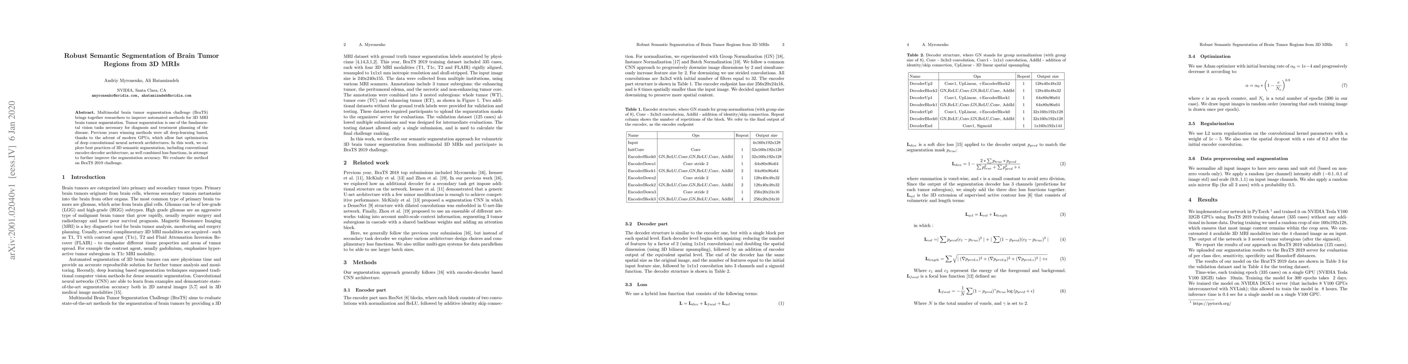Multimodal brain tumor segmentation challenge (BraTS) brings together researchers to improve automated methods for 3D MRI brain tumor segmentation. Tumor segmentation is one of the fundamental vision tasks necessary for diagnosis and treatment planning of the disease. Previous years winning methods were all deep-learning based, thanks to the advent of modern GPUs, which allow fast optimization of deep convolutional neural network architectures. In this work, we explore best practices of 3D semantic segmentation, including conventional encoder-decoder architecture, as well combined loss functions, in attempt to further improve the segmentation accuracy. We evaluate the method on BraTS 2019 challenge.