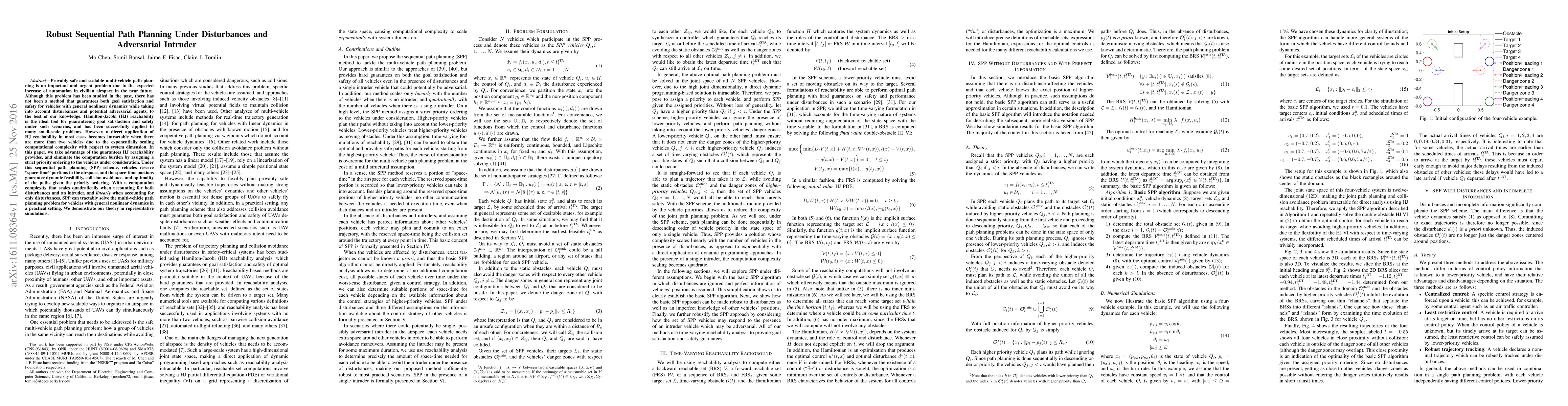 Provably safe and scalable multi-vehicle path planning is an important and urgent problem due to the expected increase of automation in civilian airspace in the near future. Although this problem has been studied in the past, there has not been a method that guarantees both goal satisfaction and safety for vehicles with general nonlinear dynamics while taking into account disturbances and potential adversarial agents, to the best of our knowledge. Hamilton-Jacobi (HJ) reachability is the ideal tool for guaranteeing goal satisfaction and safety under such scenarios, and has been successfully applied to many small-scale problems. However, a direct application of HJ reachability in most cases becomes intractable when there are more than two vehicles due to the exponentially scaling computational complexity with respect to system dimension. In this paper, we take advantage of the guarantees HJ reachability provides, and eliminate the computation burden by assigning a strict priority ordering to the vehicles under consideration. Under this sequential path planning (SPP) scheme, vehicles reserve "space-time" portions in the airspace, and the space-time portions guarantee dynamic feasibility, collision avoidance, and optimality of the paths given the priority ordering. With a computation complexity that scales quadratically when accounting for both disturbances and an intruder, and linearly when accounting for only disturbances, SPP can tractably solve the multi-vehicle path planning problem for vehicles with general nonlinear dynamics in a practical setting. We demonstrate our theory in representative simulations.