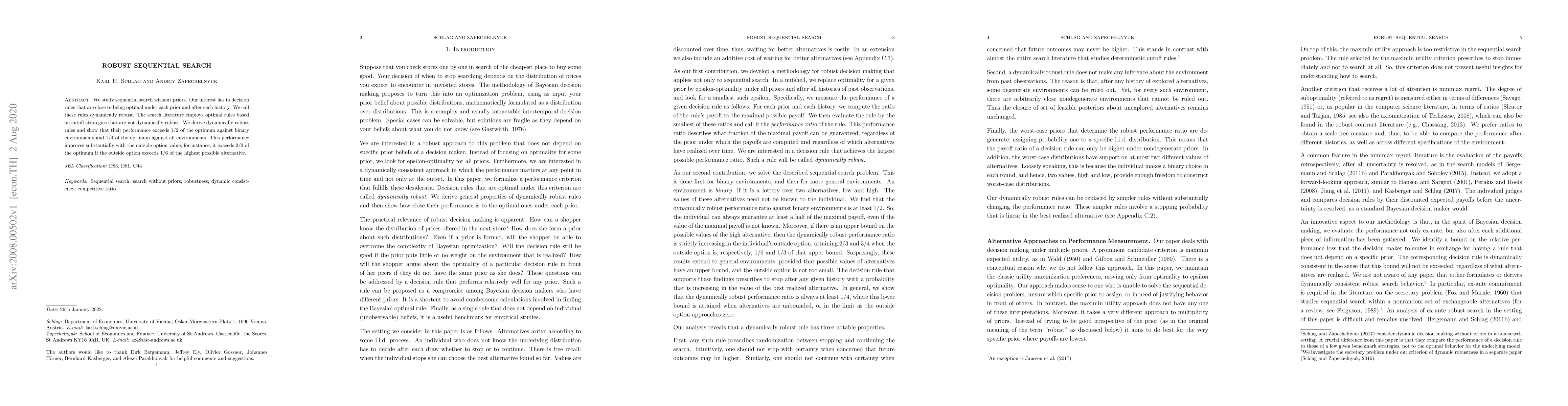 We study sequential search without priors. Our interest lies in decision rules that are close to being optimal under each prior and after each history. We call these rules dynamically robust. The search literature employs optimal rules based on cutoff strategies that are not dynamically robust. We derive dynamically robust rules and show that their performance exceeds 1/2 of the optimum against binary environments and 1/4 of the optimum against all environments. This performance improves substantially with the outside option value, for instance, it exceeds 2/3 of the optimum if the outside option exceeds 1/6 of the highest possible alternative.
