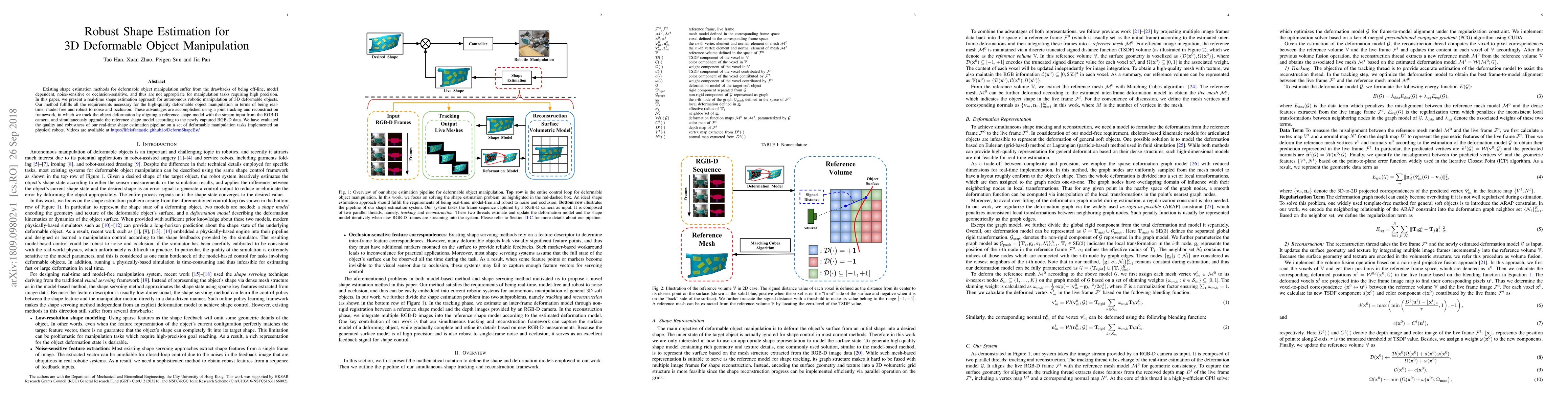 This paper introduces a real-time, model-free shape estimation method for robotic manipulation of 3D deformable objects, addressing noise and occlusion challenges through a joint tracking and reconstruction framework. The proposed method is validated through practical deformable object manipulation tasks on physical robots.
