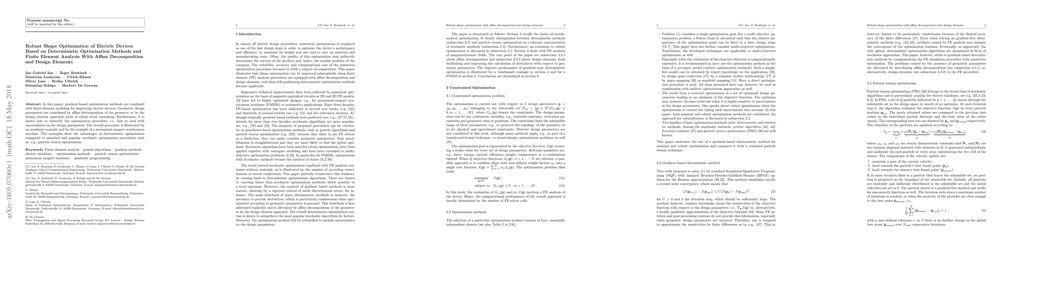 In this paper, gradient-based optimization methods are combined with finite-element modeling for improving electric devices. Geometric design parameters are considered by affine decomposition of the geometry or by the design element approach, both of which avoid remeshing. Furthermore, it is shown how to robustify the optimization procedure, i.e., how to deal with uncertainties on the design parameters. The overall procedure is illustrated by an academic example and by the example of a permanent-magnet synchronous machine. The examples show the advantages of deterministic optimization compared to standard and popular stochastic optimization procedures such as, e.g., particle swarm optimization.