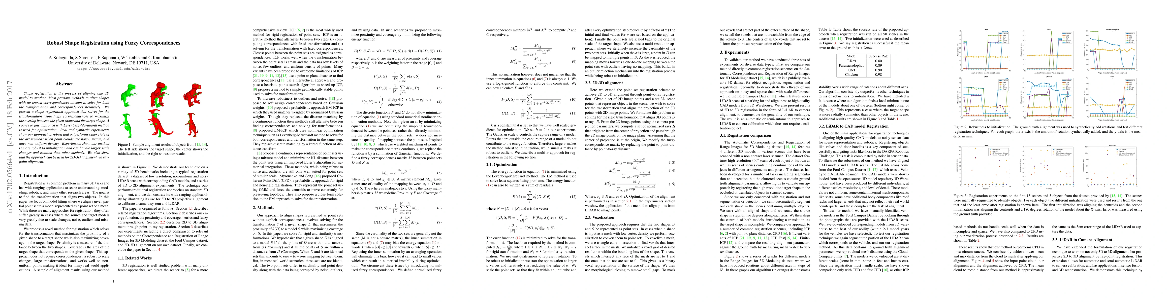 This paper proposes a robust shape registration method using fuzzy correspondences to align 3D models, employing a coarse-to-fine optimization with the Levenberg-Marquardt method. The approach demonstrates superior performance in handling noisy, sparse, and non-uniform point clouds, showing robustness to initialization and larger scale transformations compared to other state-of-the-art methods.