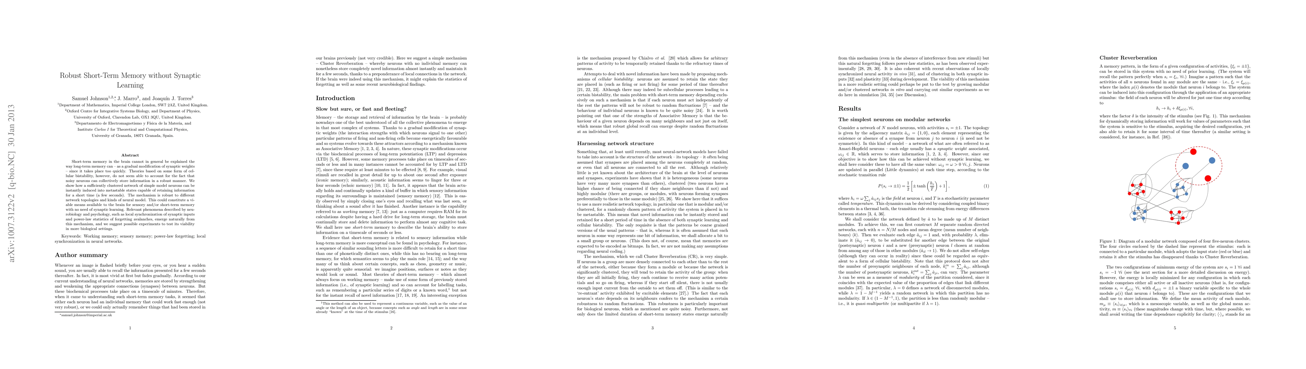This paper proposes a novel mechanism for short-term memory in neural networks based on metastable states without synaptic learning, demonstrating robustness across different network topologies and neuron models. The suggested mechanism naturally explains phenomena like local synchronization and power-law forgetting, offering a potential biological basis for sensory and short-term memory.
