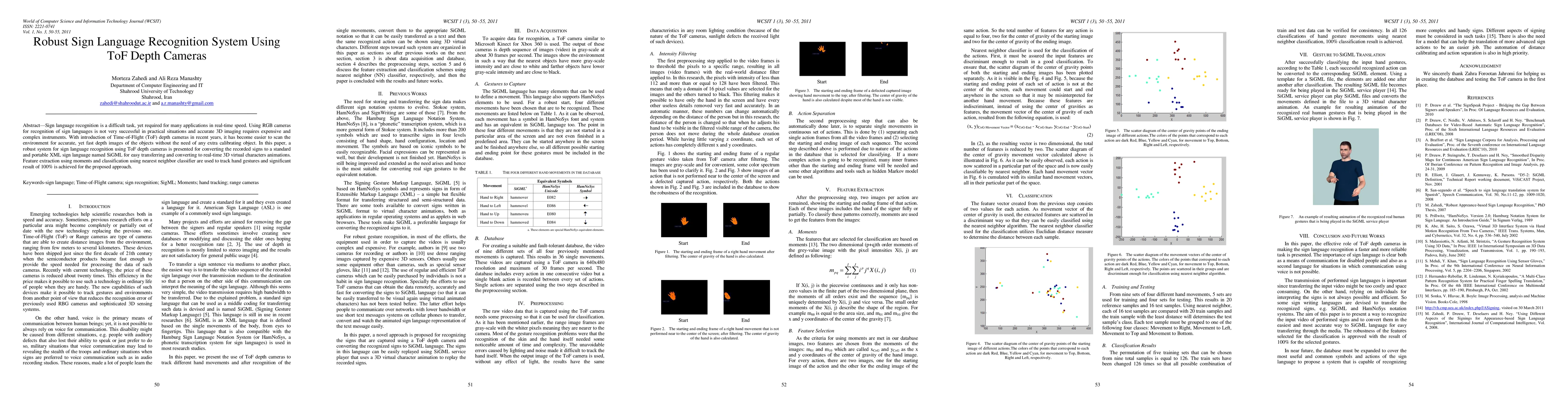 This paper presents a sign language recognition system using Time-of-Flight (ToF) depth cameras, specifically Microsoft Kinect for Xbox 360, which captures depth sequences in gray-scale at 30 frames per second. The system uses moments for feature extraction and a nearest neighbor classifier for classification.