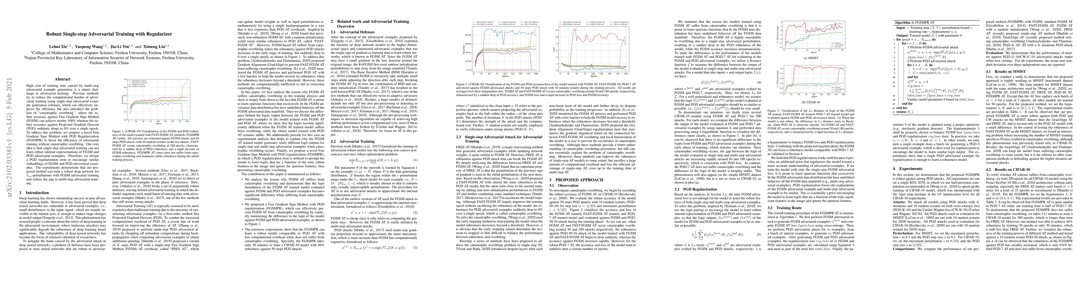 This paper proposes a novel Fast Gradient Sign Method with PGD Regularization (FGSMPR) to enhance adversarial training efficiency while mitigating catastrophic overfitting. The method introduces a PGD regularization term to align FGSM and PGD adversarial examples, achieving robust accuracy against both attack methods.