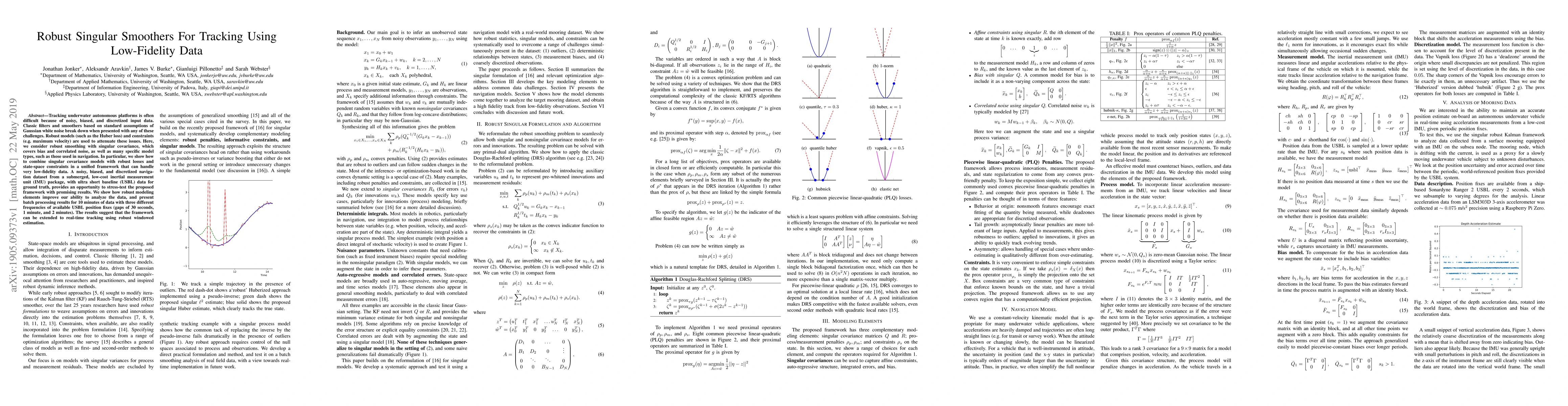 Tracking underwater autonomous platforms is often difficult because of noisy, biased, and discretized input data. Classic filters and smoothers based on standard assumptions of Gaussian white noise break down when presented with any of these challenges. Robust models (such as the Huber loss) and constraints (e.g. maximum velocity) are used to attenuate these issues. Here, we consider robust smoothing with singular covariance, which covers bias and correlated noise, as well as many specific model types, such as those used in navigation. In particular, we show how to combine singular covariance models with robust losses and state-space constraints in a unified framework that can handle very low-fidelity data. A noisy, biased, and discretized navigation dataset from a submerged, low-cost inertial measurement unit (IMU) package, with ultra short baseline (USBL) data for ground truth, provides an opportunity to stress-test the proposed framework with promising results. We show how robust modeling elements improve our ability to analyze the data, and present batch processing results for 10 minutes of data with three different frequencies of available USBL position fixes (gaps of 30 seconds, 1 minute, and 2 minutes). The results suggest that the framework can be extended to real-time tracking using robust windowed estimation.