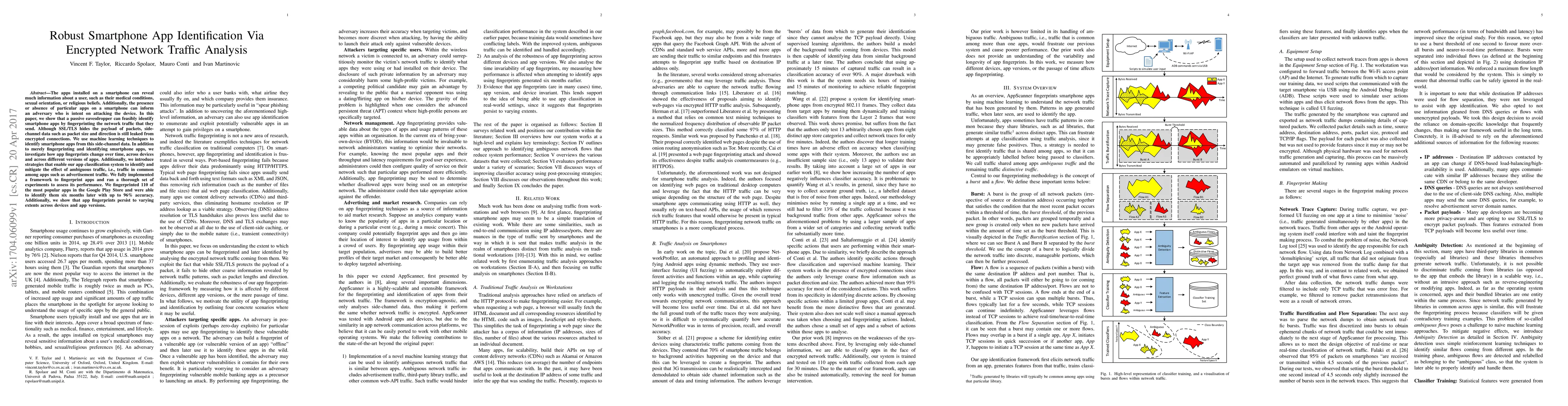 This paper demonstrates how a passive eavesdropper can identify smartphone apps by analyzing encrypted network traffic side-channel data, using machine learning for app fingerprinting. The study shows high accuracy in identifying popular apps over time and across devices, while also addressing the challenge of ambiguous traffic.