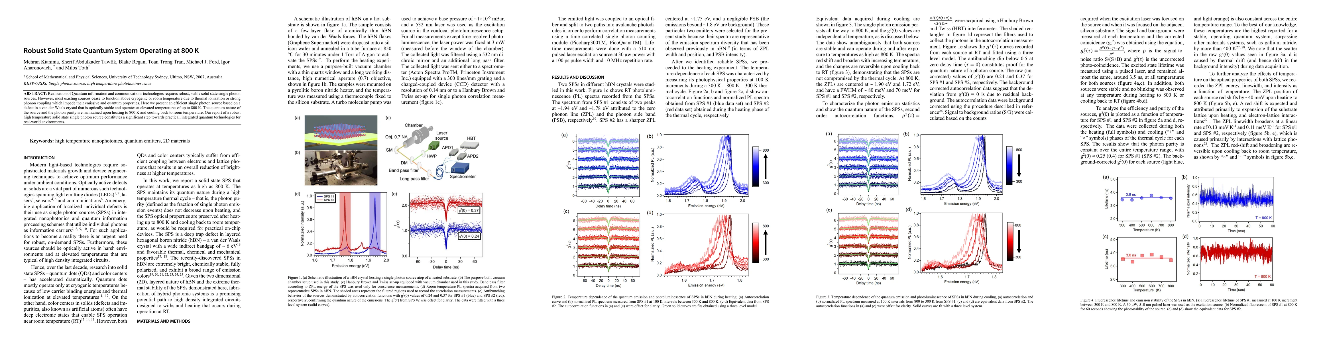 Realization of Quantum information and communications technologies requires robust, stable solid state single photon sources. However, most existing sources cease to function above cryogenic or room temperature due to thermal ionization or strong phonon coupling which impede their emissive and quantum properties. Here we present an efficient single photon source based on a defect in a van der Waals crystal that is optically stable and operates at elevated temperatures of up to 800 K. The quantum nature of the source and the photon purity are maintained upon heating to 800 K and cooling back to room temperature. Our report of a robust high temperature solid state single photon source constitutes a significant step to-wards practical, integrated quantum technologies for real-world environments.