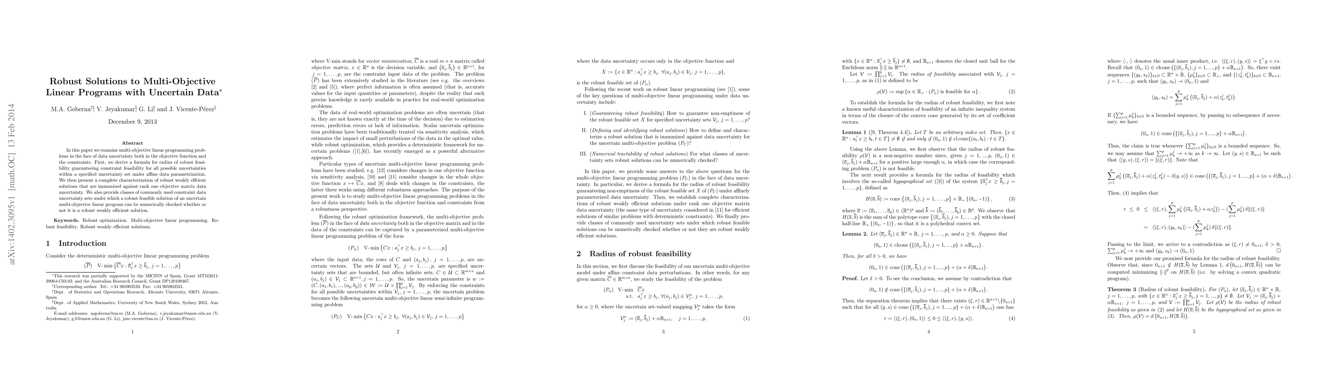 This paper develops methods for solving multi-objective linear programs with uncertain data, deriving a formula for robust feasibility and characterizing robust weakly efficient solutions under affine data parametrization. It also provides practical checks for robust feasibility under common constraint data uncertainty sets.