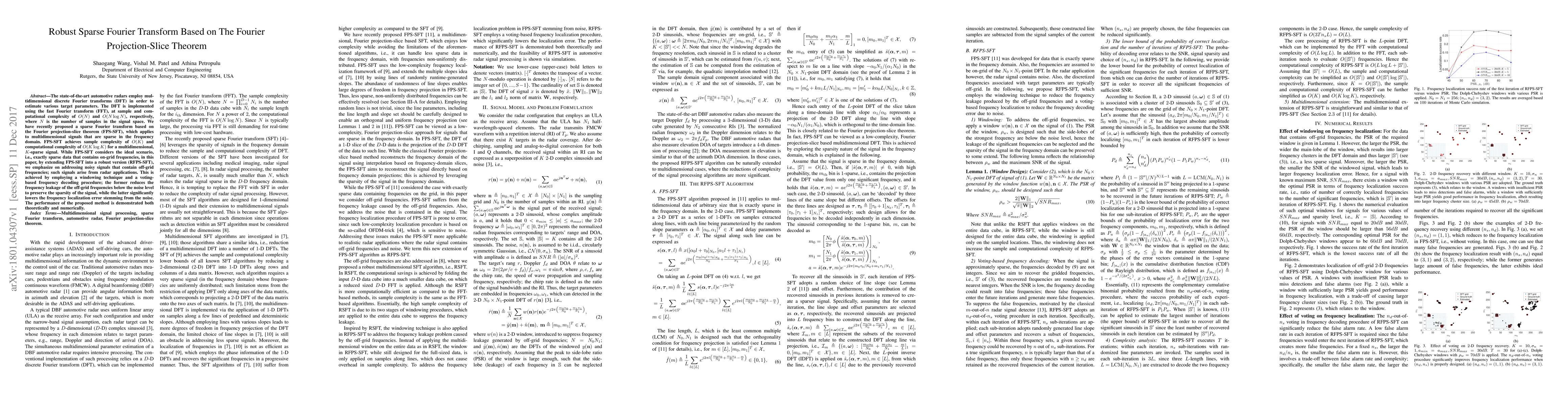 This paper proposes a robust sparse Fourier transform (RFPS-SFT) based on the Fourier projection-slice theorem to handle noisy, off-grid frequency signals in automotive radar applications. It employs a windowing technique and a voting-based frequency decoding procedure to reduce frequency leakage and localization error, achieving improved performance over the ideal sparse Fourier transform.