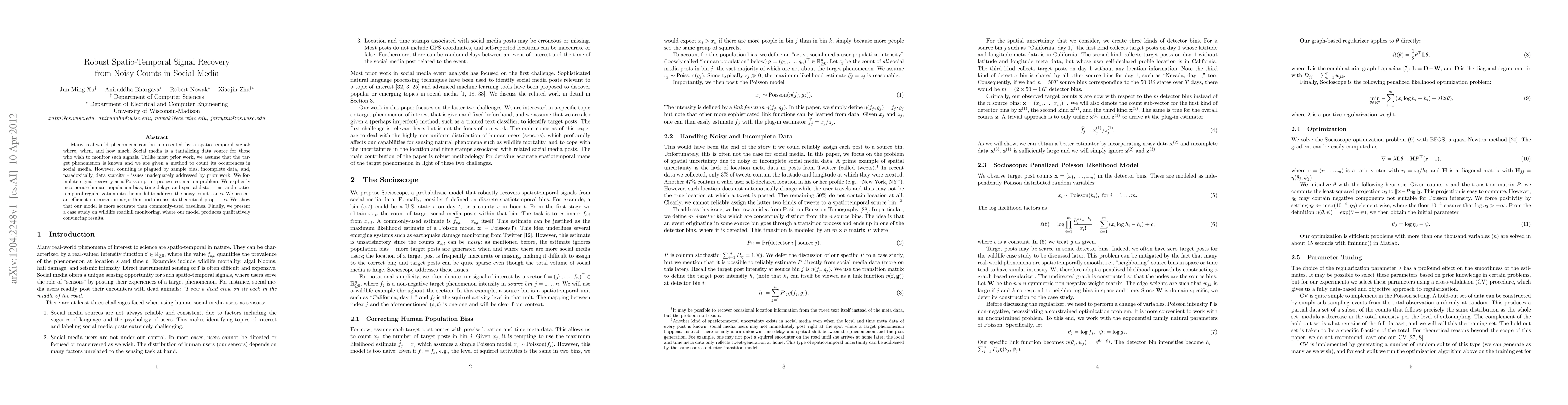 This paper proposes a robust method for recovering spatio-temporal signals from noisy social media counts, addressing issues like sample bias and incomplete data. It formulates the problem as a Poisson point process estimation, incorporating human population bias and spatial-temporal regularization, and demonstrates superior accuracy through a wildlife roadkill monitoring case study.