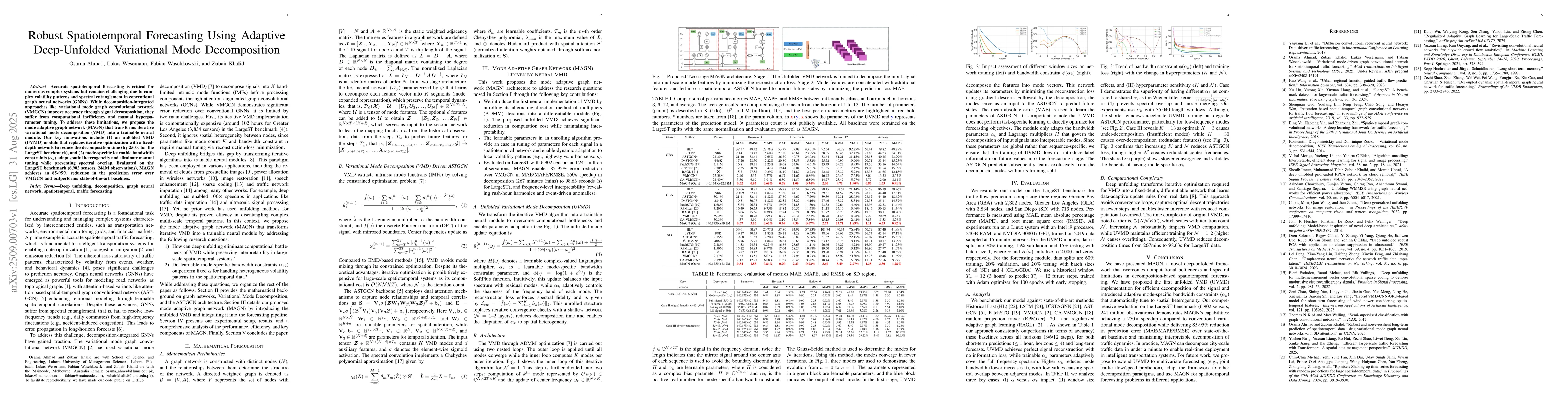 Accurate spatiotemporal forecasting is critical for numerous complex systems but remains challenging due to complex volatility patterns and spectral entanglement in conventional graph neural networks (GNNs). While decomposition-integrated approaches like variational mode graph convolutional network (VMGCN) improve accuracy through signal decomposition, they suffer from computational inefficiency and manual hyperparameter tuning. To address these limitations, we propose the mode adaptive graph network (MAGN) that transforms iterative variational mode decomposition (VMD) into a trainable neural module. Our key innovations include (1) an unfolded VMD (UVMD) module that replaces iterative optimization with a fixed-depth network to reduce the decomposition time (by 250x for the LargeST benchmark), and (2) mode-specific learnable bandwidth constraints ({\alpha}k ) adapt spatial heterogeneity and eliminate manual tuning while preventing spectral overlap. Evaluated on the LargeST benchmark (6,902 sensors, 241M observations), MAGN achieves an 85-95% reduction in the prediction error over VMGCN and outperforms state-of-the-art baselines.