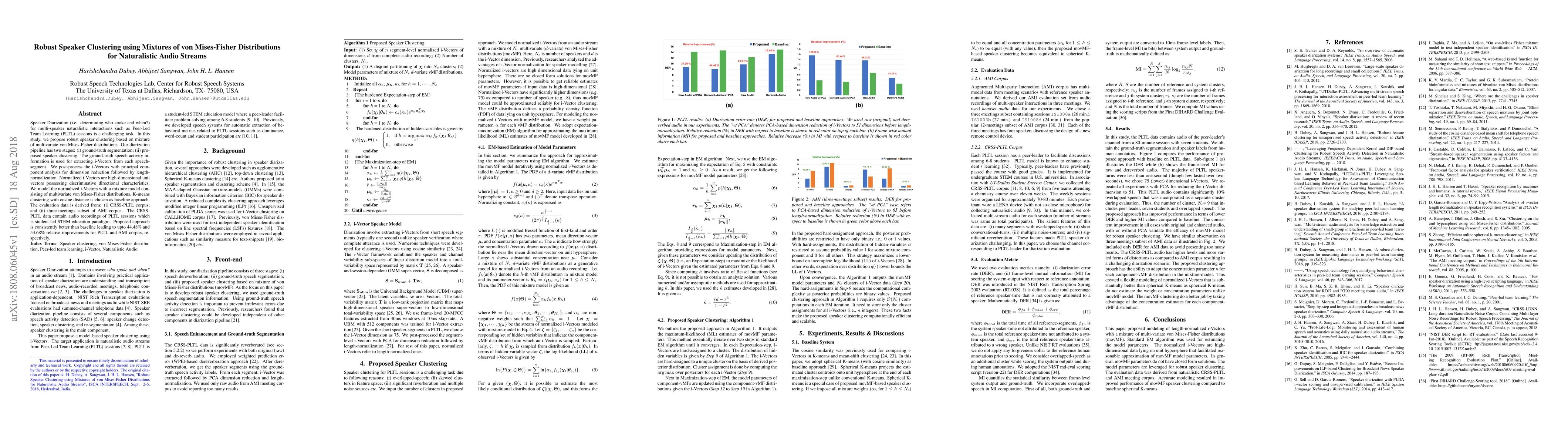 This paper proposes a robust speaker clustering method using mixtures of von Mises-Fisher distributions for diarization in multi-speaker naturalistic audio streams. The approach shows significant improvements over baseline K-means clustering, achieving up to 53.68% relative improvement on the AMI corpus.