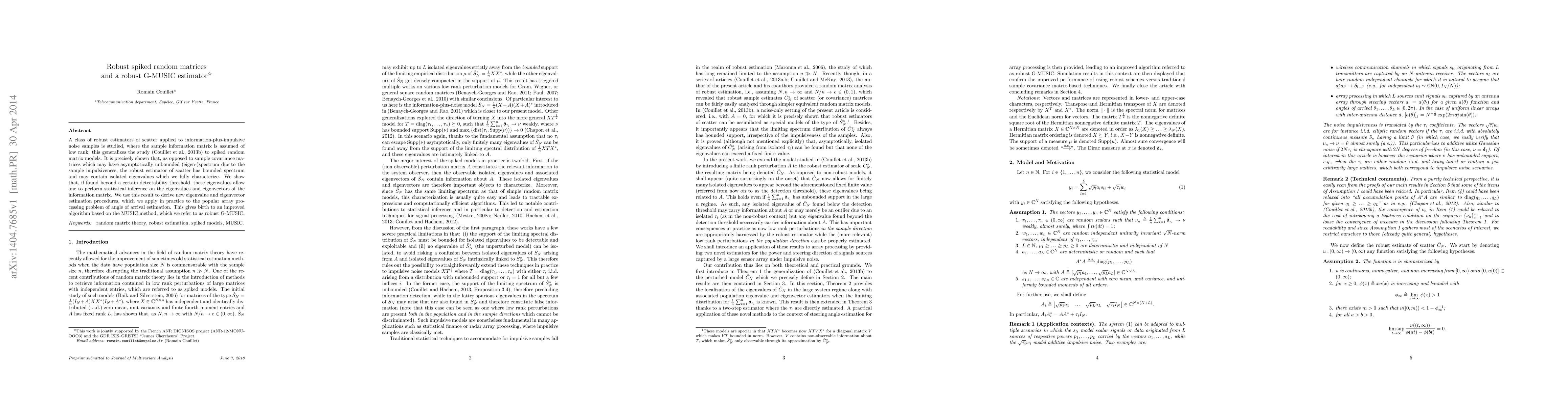 A class of robust estimators of scatter applied to information-plus-impulsive noise samples is studied, where the sample information matrix is assumed of low rank; this generalizes the study of (Couillet et al., 2013b) to spiked random matrix models. It is precisely shown that, as opposed to sample covariance matrices which may have asymptotically unbounded (eigen-)spectrum due to the sample impulsiveness, the robust estimator of scatter has bounded spectrum and may contain isolated eigenvalues which we fully characterize. We show that, if found beyond a certain detectability threshold, these eigenvalues allow one to perform statistical inference on the eigenvalues and eigenvectors of the information matrix. We use this result to derive new eigenvalue and eigenvector estimation procedures, which we apply in practice to the popular array processing problem of angle of arrival estimation. This gives birth to an improved algorithm based on the MUSIC method, which we refer to as robust G-MUSIC.