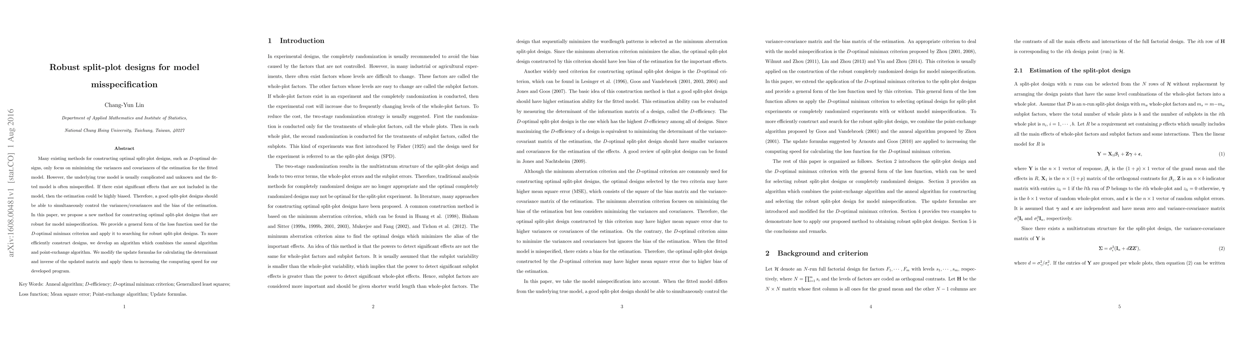 This paper proposes a new method for constructing robust split-plot designs that address model misspecification by controlling both estimation variance and bias. It introduces a D-optimal minimax criterion and combines annealing and point-exchange algorithms to efficiently find these designs, enhancing computational speed through modified determinant and inverse calculations.