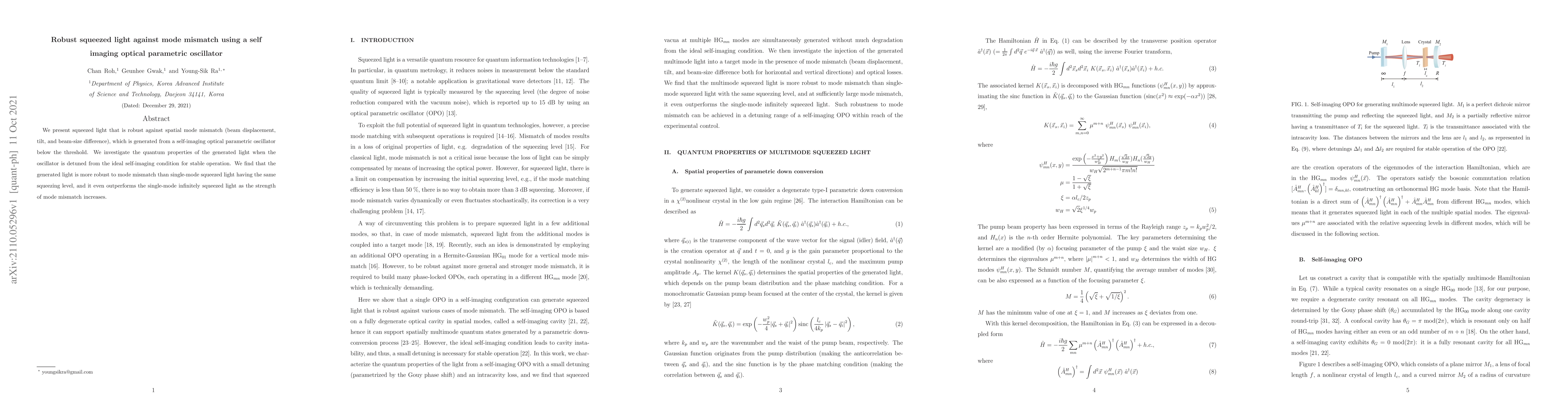 This paper demonstrates squeezed light generated from a self-imaging optical parametric oscillator that remains robust against spatial mode mismatch. The study finds that this light outperforms single-mode squeezed light in terms of resilience to beam displacement, tilt, and size differences.