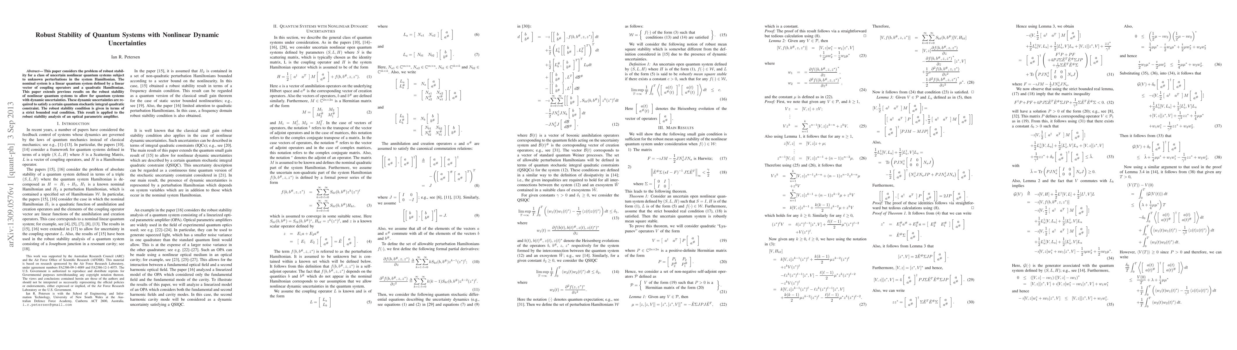 This paper considers the problem of robust stability for a class of uncertain nonlinear quantum systems subject to unknown perturbations in the system Hamiltonian. The nominal system is a linear quantum system defined by a linear vector of coupling operators and a quadratic Hamiltonian. This paper extends previous results on the robust stability of nonlinear quantum systems to allow for quantum systems with dynamic uncertainties. These dynamic uncertainties are required to satisfy a certain quantum stochastic integral quadratic constraint. The robust stability condition is given in terms of a strict bounded real condition. This result is applied to the robust stability analysis of an optical parametric amplifier.