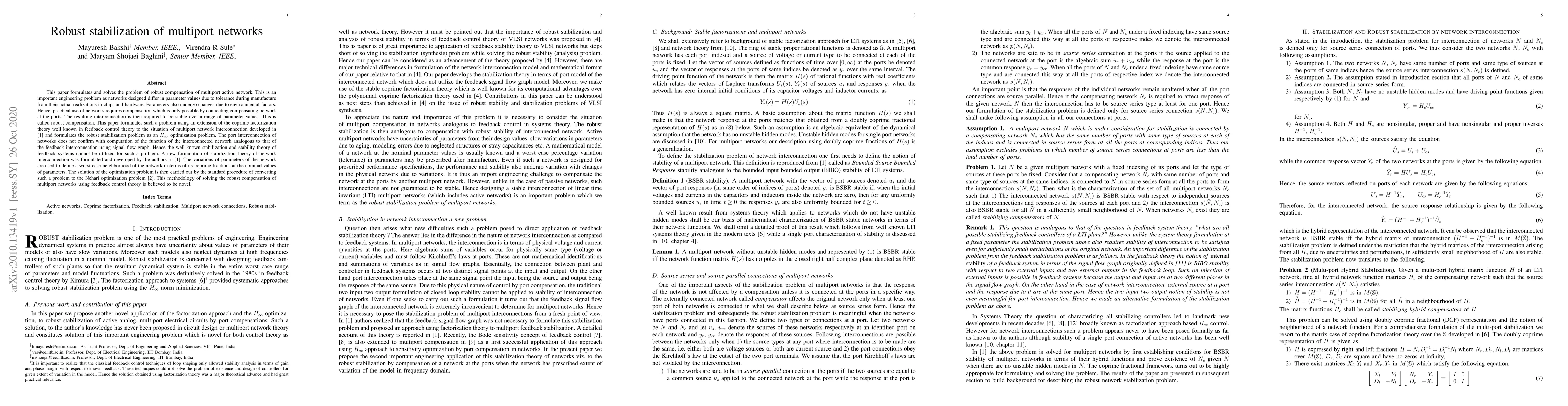 This paper introduces a novel method using feedback control theory for robust stabilization of multiport networks, addressing parameter variations due to manufacturing tolerances and environmental factors. It formulates the problem as an $H_{infty}$ optimization problem and develops a new stabilization theory for network interconnections, converting it into a Nehari optimization problem for solution.