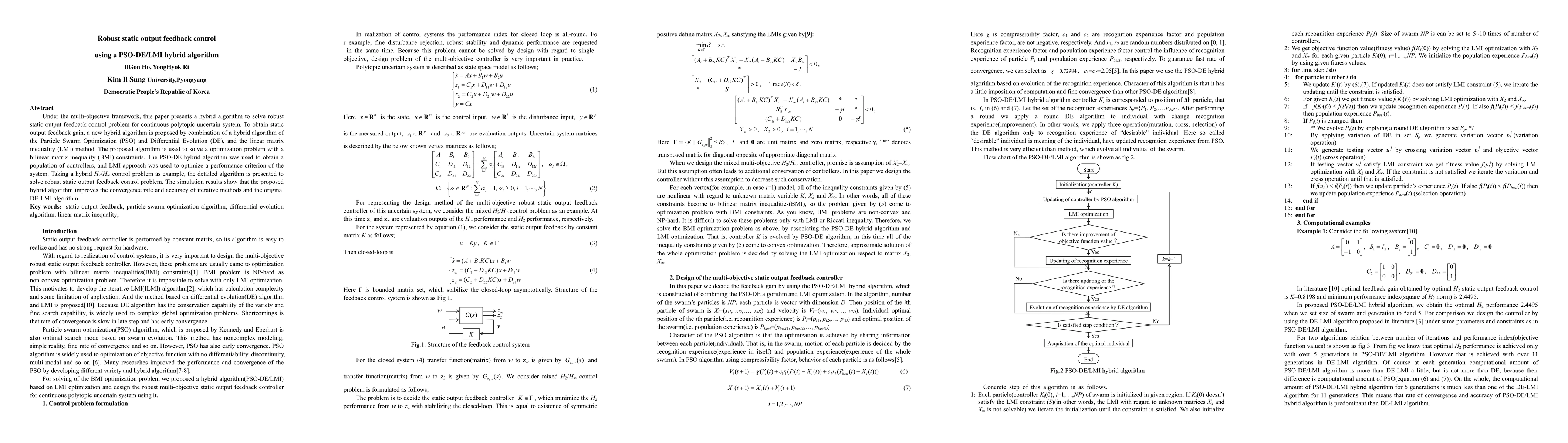 Under the multi-objective framework, this paper presents a hybrid algorithm to solve robust static output feedback control problem for continuous poly-topic uncertain system. To obtain static output feedback gain, a new hybrid algorithm is proposed by combination of a hybrid algorithm of the Particle Swarm Optimization and Differential Evolution (DE), and the linear matrix inequality method. The proposed algorithm is used to solve a optimization problem with a bi-linear matrix inequality constraints. The Particle Swarm Optimization-DE hybrid algorithm was used to obtain a population of controllers, and linear matrix inequality approach was used to optimize a performance criterion of the system. Taking a hybrid H 2/H infinite control problem as example, the detailed algorithm is presented to solve robust static output feedback control problem. The simulation results show that the proposed hybrid algorithm improves the convergence rate and accuracy of iterative methods and the original DE-linear matrix inequality algorithm.