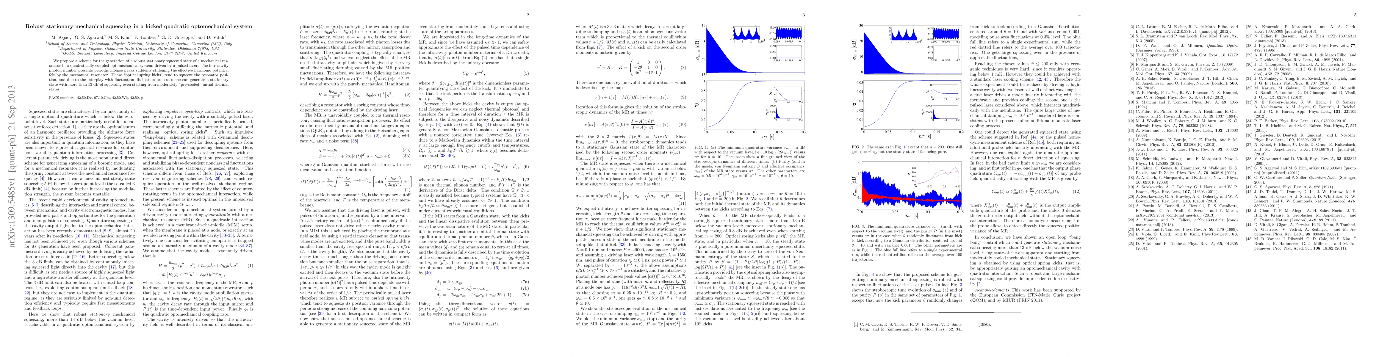 This paper proposes a method to generate a robust stationary squeezed state in a mechanical resonator within a quadratically coupled optomechanical system driven by a pulsed laser, achieving over 13 dB of squeezing through "optical spring kicks" that periodically stiffen the mechanical resonator's effective potential. The scheme can produce significant squeezing even from moderately cooled initial thermal states.
