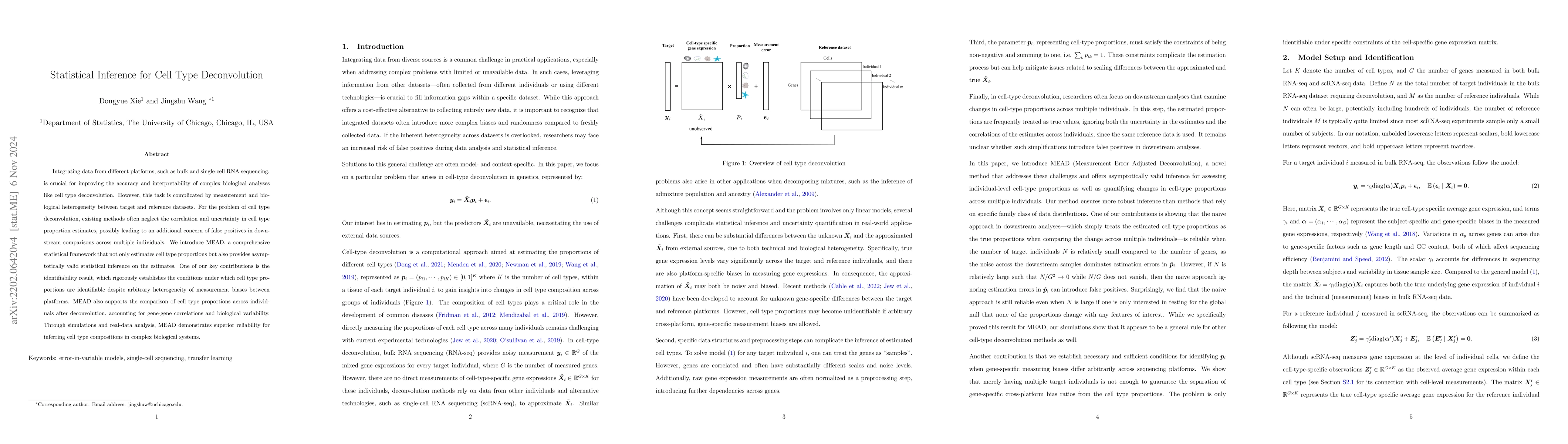 Cell type deconvolution is a computational method that estimates the proportions of different cell types within bulk transcriptomics data by leveraging information from reference single-cell RNA sequencing data. Despite its origin as a simple linear regression model, this approach faces challenges due to technical and biological variability and biases between the bulk and single-cell datasets. While several new methods have been developed, most only provide point estimates of cell type proportions, neglecting the uncertainty inherent in these estimates. Consequently, false positives can arise when comparing changes in cell type proportions across multiple individuals. In this paper, we introduce MEAD, a comprehensive statistical framework for efficient cell type deconvolution. Our approach constructs asymptotically valid confidence intervals for individual cell type proportions, as well as for quantifying changes in cell type proportions across multiple individuals. Our analysis accounts for factors such as biological variability in gene expressions, gene-gene dependence, cross-platform biases, and sequencing errors, without relying on parametric assumptions about the data distributions. Moreover, we establish necessary and sufficient conditions for identifying cell type proportions in the presence of platform-specific biases across sequencing technologies.