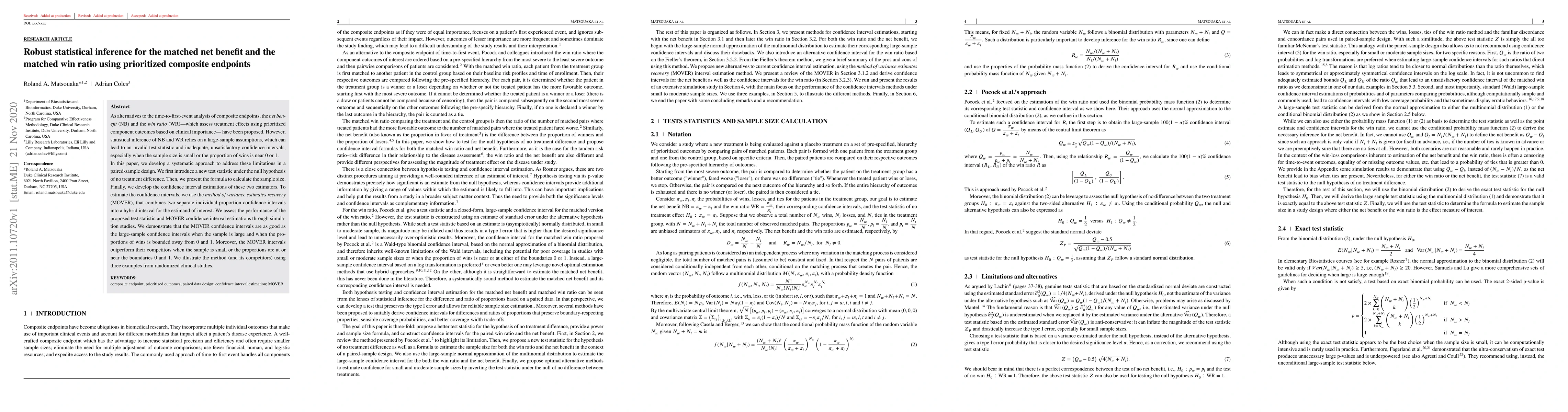 This paper develops a new approach to statistical inference for matched net benefit and win ratio using prioritized composite endpoints, addressing limitations in large-sample assumptions and providing improved confidence intervals for small sample sizes or near-zero/near-one proportions.
