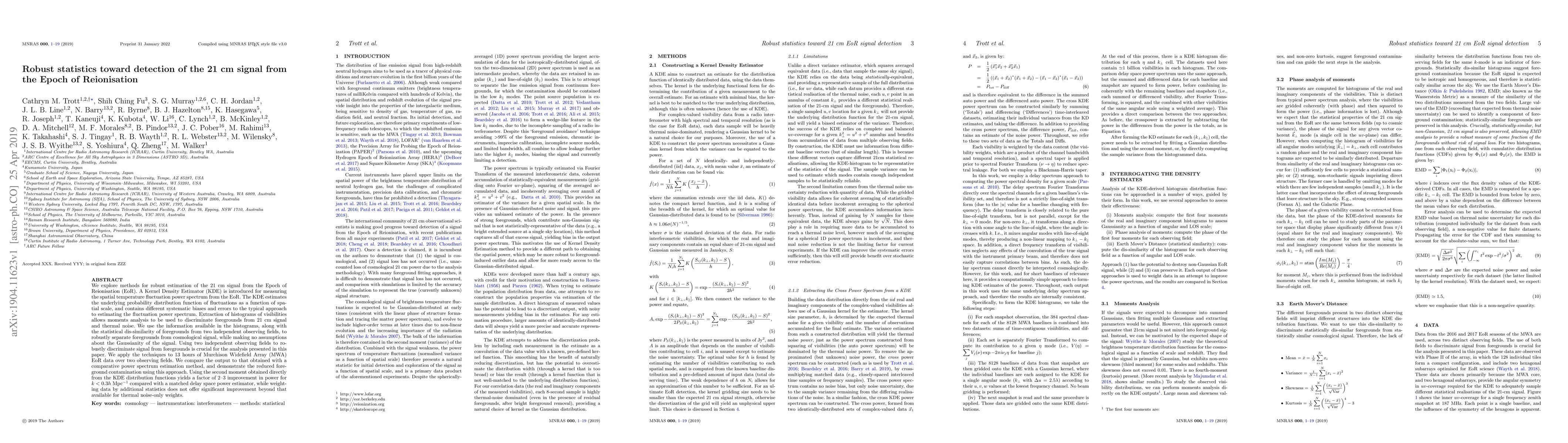 We explore methods for robust estimation of the 21 cm signal from the Epoch of Reionisation (EoR). A Kernel Density Estimator (KDE) is introduced for measuring the spatial temperature fluctuation power spectrum from the EoR. The KDE estimates the underlying probability distribution function of fluctuations as a function of spatial scale, and contains different systematic biases and errors to the typical approach to estimating the fluctuation power spectrum. Extraction of histograms of visibilities allows moments analysis to be used to discriminate foregrounds from 21 cm signal and thermal noise. We use the information available in the histograms, along with the statistical dis-similarity of foregrounds from two independent observing fields, to robustly separate foregrounds from cosmological signal, while making no assumptions about the Gaussianity of the signal. Using two independent observing fields to robustly discriminate signal from foregrounds is crucial for the analysis presented in this paper. We apply the techniques to 13 hours of Murchison Widefield Array (MWA) EoR data over two observing fields. We compare the output to that obtained with a comparative power spectrum estimation method, and demonstrate the reduced foreground contamination using this approach. Using the second moment obtained directly from the KDE distribution functions yields a factor of 2-3 improvement in power for k < 0.3hMpc^{-1} compared with a matched delay space power estimator, while weighting data by additional statistics does not offer significant improvement beyond that available for thermal noise-only weights.