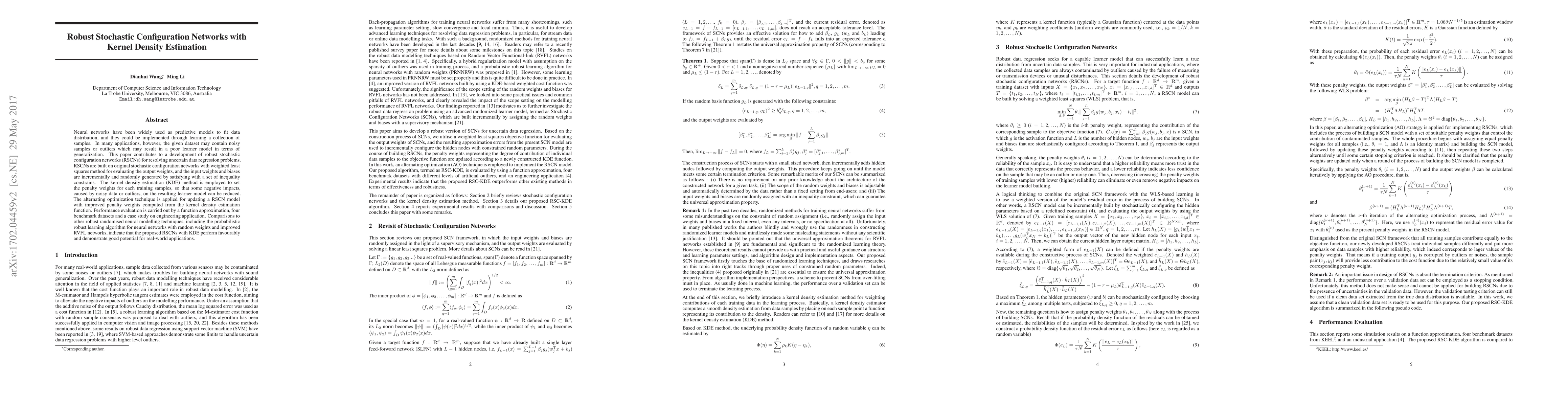 This paper develops robust stochastic configuration networks (RSCNs) with kernel density estimation (KDE) to address uncertain data regression problems, especially in the presence of noisy samples or outliers. The RSCNs use weighted least squares and incremental random generation of weights and biases, while KDE sets penalty weights to mitigate negative impacts from noisy data, leading to improved model performance.