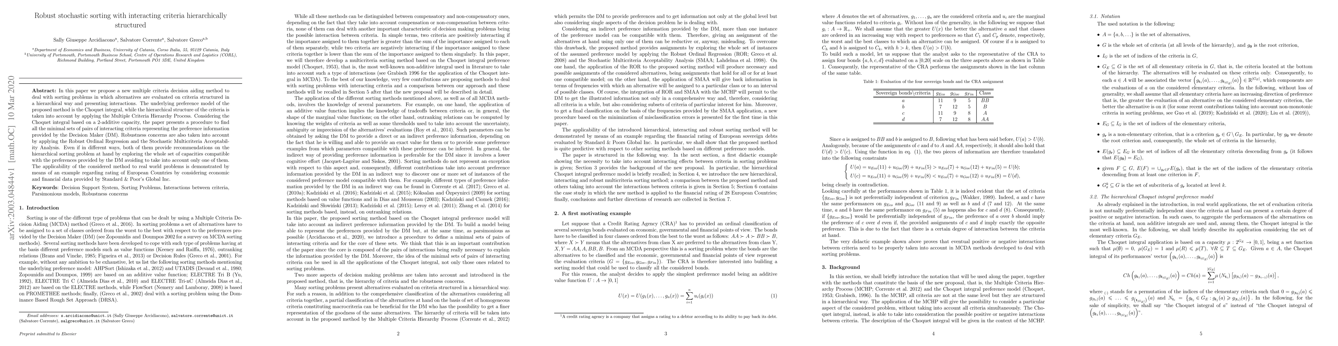 This paper introduces a novel decision aiding method for sorting problems involving hierarchically structured criteria with interactions, employing the Choquet integral and Multiple Criteria Hierarchy Process. It also incorporates robustness through Robust Ordinal Regression and Stochastic Multicriteria Acceptability Analysis, and demonstrates its application via an example on rating European countries using economic and financial data.