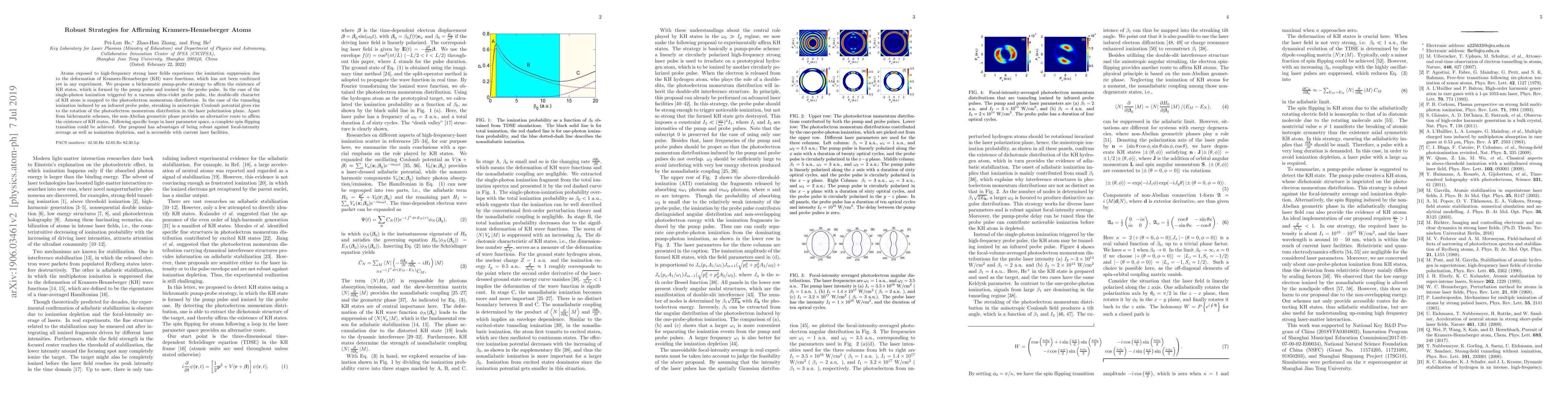 This paper proposes robust strategies to experimentally affirm the existence of Kramers-Henneberger (KH) states in atoms exposed to strong laser fields, using bichromatic pump-probe techniques and non-Abelian geometric phase methods. The proposed methods are robust against focal-intensity average and ionization depletion, and are feasible with current laser technology.