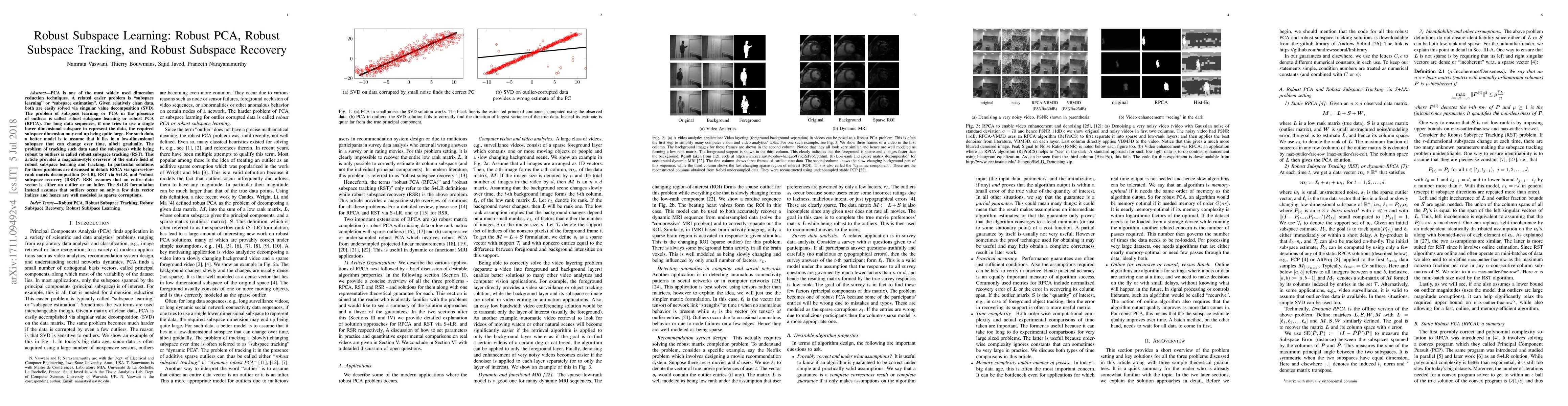 This paper provides an overview of robust subspace learning techniques, focusing on robust PCA (RPCA), robust subspace tracking (RST), and robust subspace recovery (RSR). It discusses solutions for these problems using sparse+low-rank matrix decomposition to handle outliers effectively.