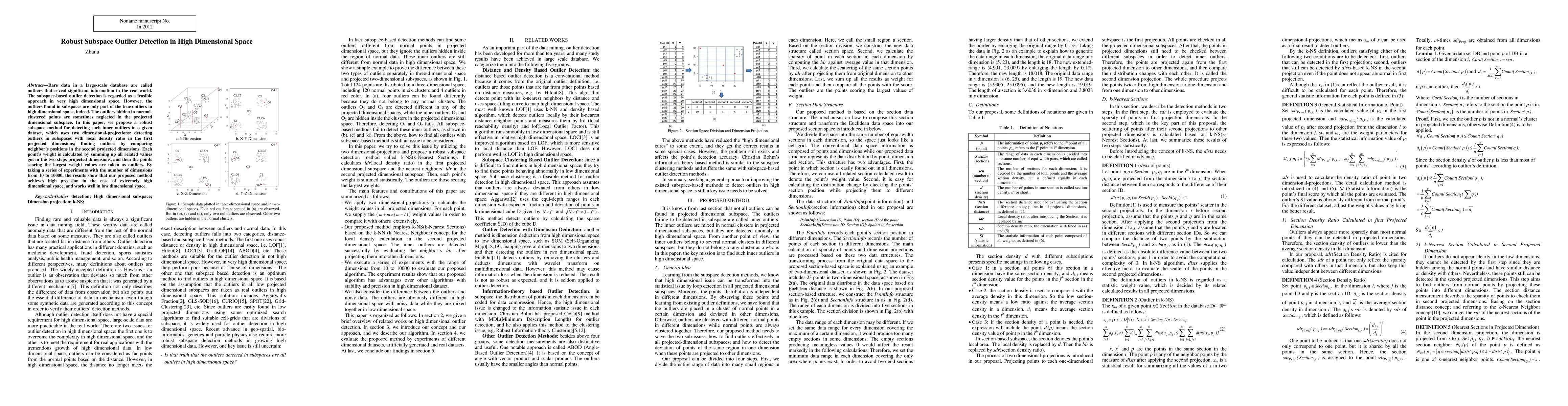 This paper proposes a robust subspace outlier detection method that identifies inner outliers in high-dimensional space using two-dimensional projections and local density ratios. The method calculates each point's weight based on detected outliers in both projected dimensions, achieving high precision in both high and low dimensional datasets.
