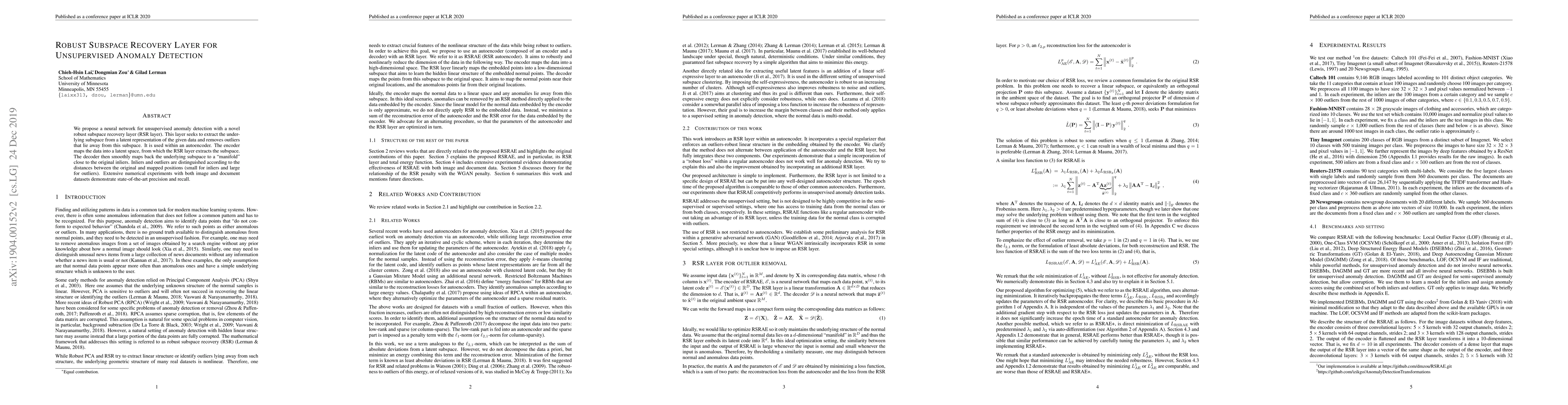 A new neural network architecture uses a robust subspace recovery layer to detect anomalies in data, achieving state-of-the-art precision and recall in image and document datasets.