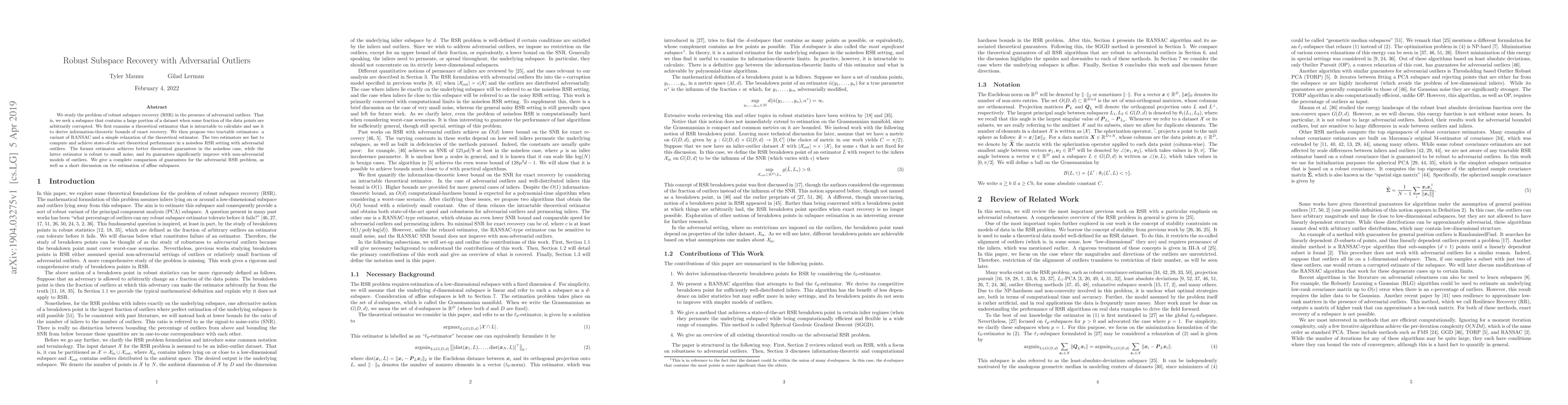 We study the problem of robust subspace recovery (RSR) in the presence of adversarial outliers. That is, we seek a subspace that contains a large portion of a dataset when some fraction of the data points are arbitrarily corrupted. We first examine a theoretical estimator that is intractable to calculate and use it to derive information-theoretic bounds of exact recovery. We then propose two tractable estimators: a variant of RANSAC and a simple relaxation of the theoretical estimator. The two estimators are fast to compute and achieve state-of-the-art theoretical performance in a noiseless RSR setting with adversarial outliers. The former estimator achieves better theoretical guarantees in the noiseless case, while the latter estimator is robust to small noise, and its guarantees significantly improve with non-adversarial models of outliers. We give a complete comparison of guarantees for the adversarial RSR problem, as well as a short discussion on the estimation of affine subspaces.