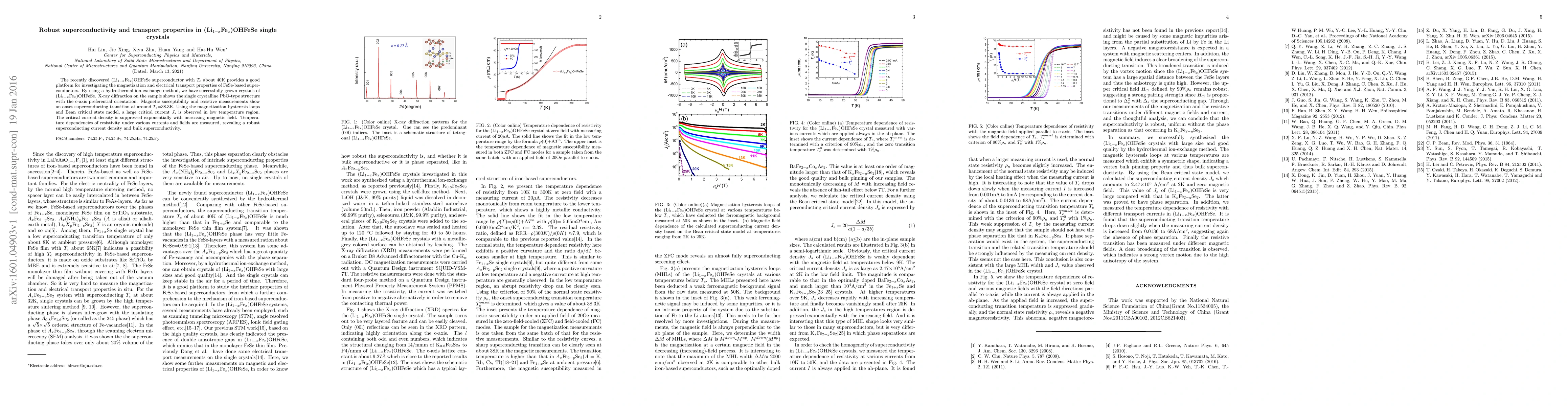 Researchers have grown single crystals of (Li1-xFex)OHFeSe, a superconductor with a critical temperature of around 40K, and observed robust superconductivity and high critical current densities in low-temperature regions.
