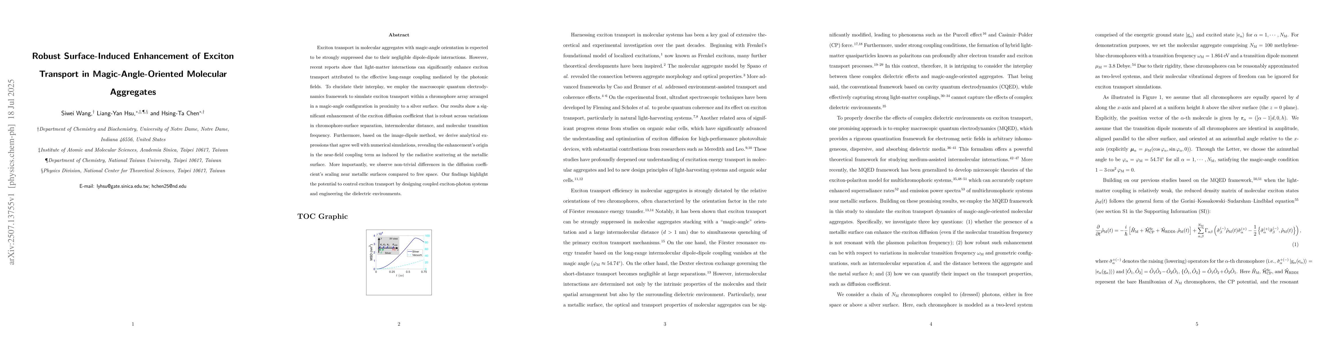 Exciton transport in molecular aggregates with magic-angle orientation is expected to be strongly suppressed due to their negligible dipole-dipole interactions. However, recent reports show that light-matter interactions can significantly enhance exciton transport attributed to the effective long-range coupling mediated by the photonic fields. To elucidate their interplay, we employ the macroscopic quantum electrodynamics framework to simulate exciton transport within a chromophore array arranged in a magic-angle configuration in proximity to a silver surface. Our results show a significant enhancement of the exciton diffusion coefficient that is robust across variations in chromophore-surface separation, intermolecular distance, and molecular transition frequency. Furthermore, based on the image-dipole method, we derive analytical expressions that agree well with numerical simulations, revealing the enhancement's origin in the near-field coupling term as induced by the radiative scattering at the metallic surface. More importantly, we observe non-trivial differences in the diffusion coefficient's scaling near metallic surfaces compared to free space. Our findings highlight the potential to control exciton transport by designing coupled exciton-photon systems and engineering the dielectric environments.