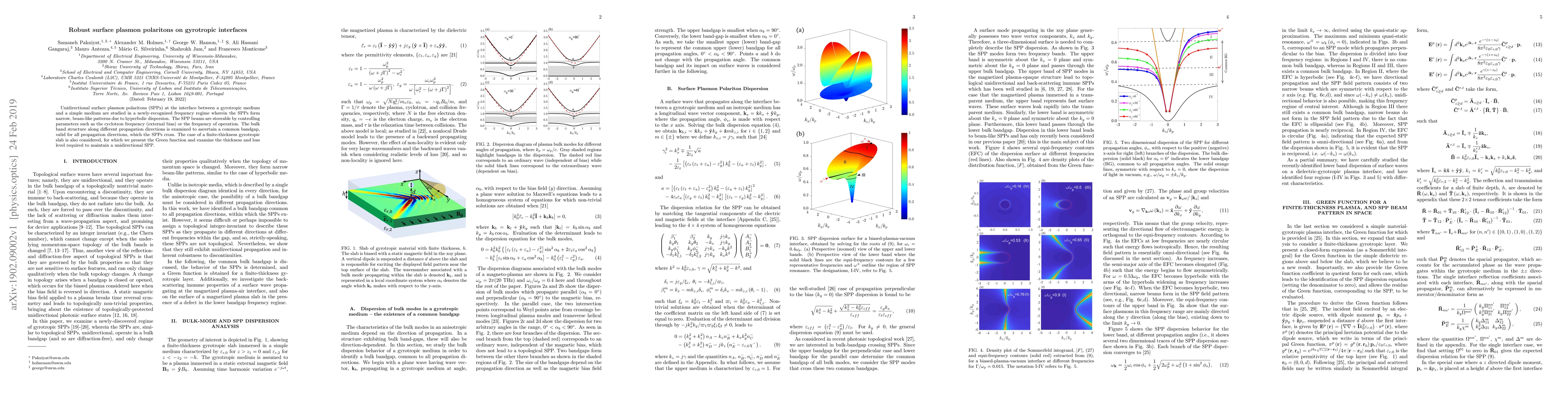 The research explores unidirectional surface plasmon polaritons (SPPs) at gyrotropic medium interfaces, revealing narrow, beam-like SPP patterns due to hyperbolic dispersion. SPP beams can be steered via external bias or frequency. A common bandgap applicable to all propagation directions is identified, and the study also examines a finite-thickness gyrotropic slab, presenting its Green function and outlining conditions for maintaining unidirectional SPPs.