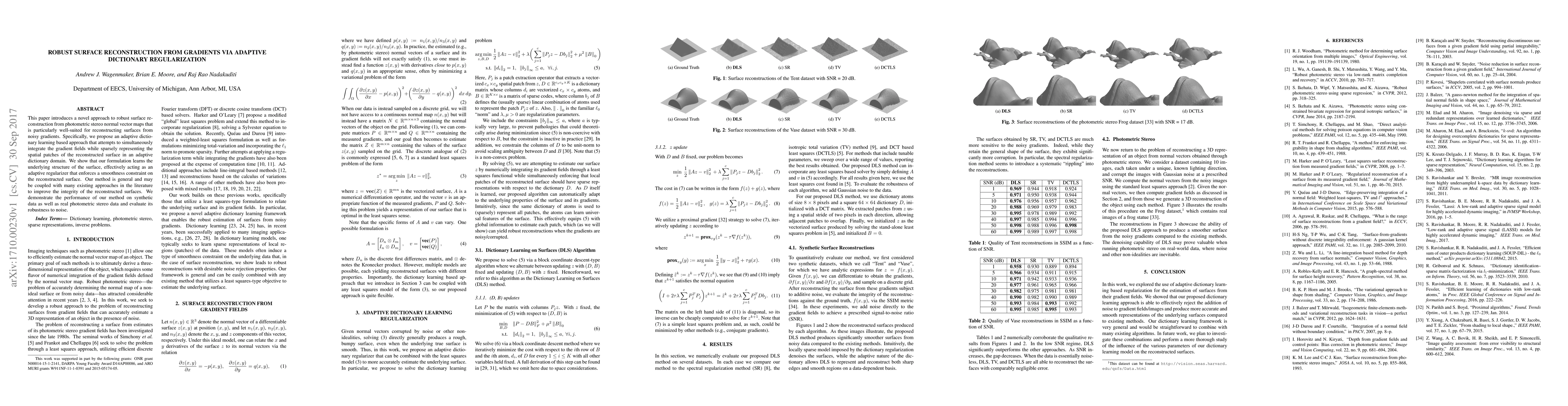 This paper proposes an adaptive dictionary learning method for robust surface reconstruction from noisy photometric stereo normal vector maps, integrating gradient fields and enforcing smoothness through adaptive regularization. The method is shown to improve surface integrity and is evaluated on both synthetic and real data.