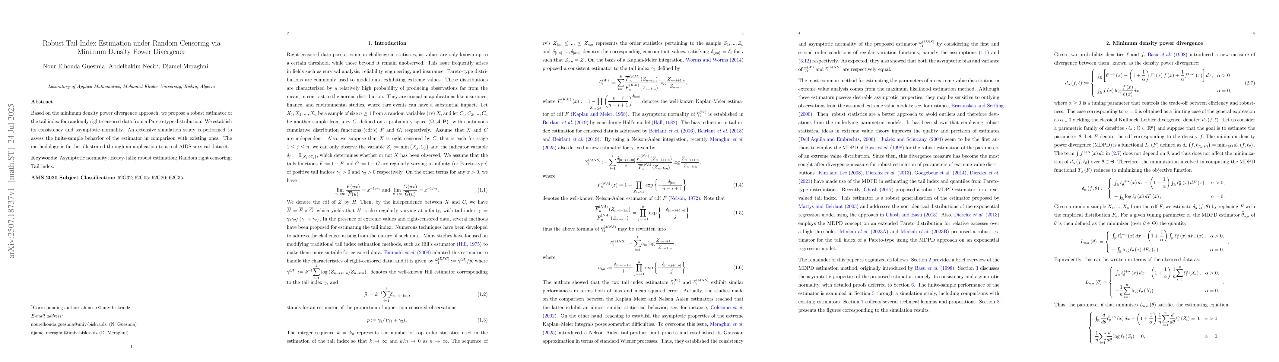 This work is novel as it is the first application of the MDPD framework to tail index estimation under censoring, providing a robust alternative to existing methods sensitive to outliers or strong parametric assumptions.