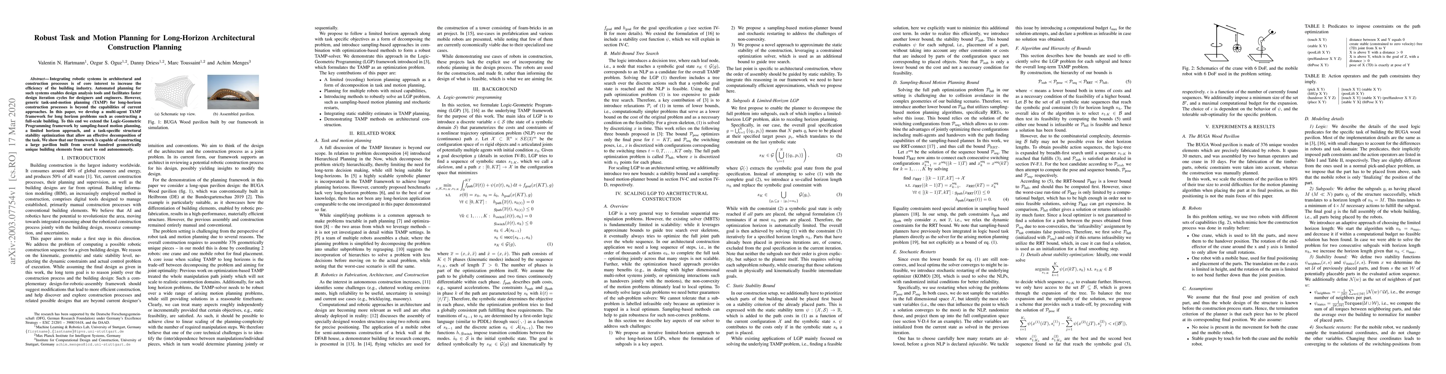 This paper presents a multi-agent task-and-motion planning framework for long-horizon architectural construction, extending Logic-Geometric Programming with sampling-based motion planning and structural stability optimization. The proposed approach successfully enables autonomous construction of a large pavilion from hundreds of unique elements.