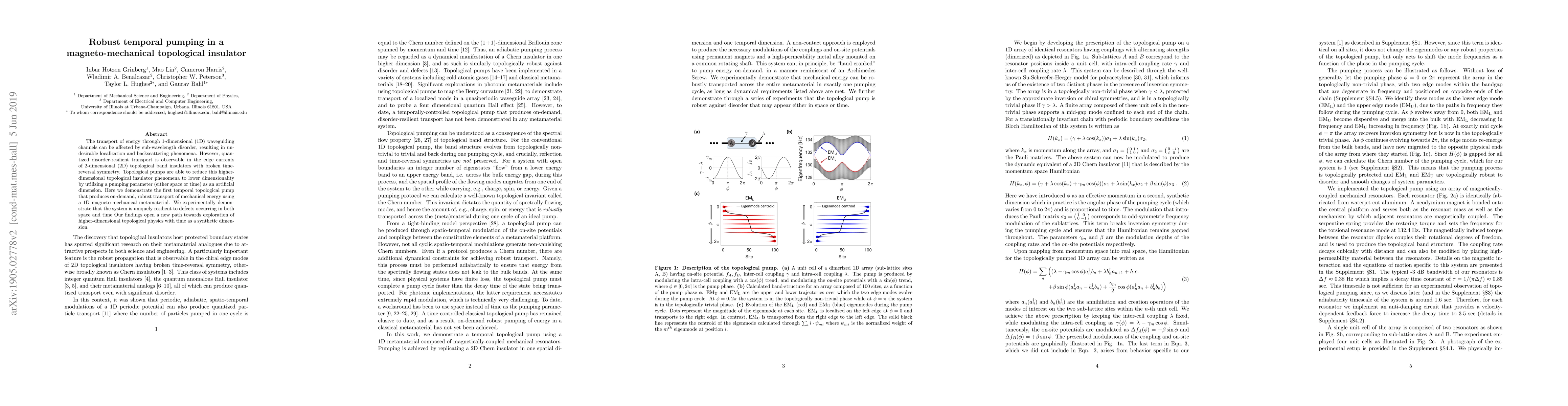 The transport of energy through 1-dimensional (1D) waveguiding channels can be affected by sub-wavelength disorder, resulting in undesirable localization and backscattering phenomena. However, quantized disorder-resilient transport is observable in the edge currents of 2-dimensional (2D) topological band insulators with broken time-reversal symmetry. Topological pumps are able to reduce this higher-dimensional topological insulator phenomena to lower dimensionality by utilizing a pumping parameter (either space or time) as an artificial dimension. Here we demonstrate the first temporal topological pump that produces on-demand, robust transport of mechanical energy using a 1D magneto-mechanical metamaterial. We experimentally demonstrate that the system is uniquely resilient to defects occurring in both space and time Our findings open a new path towards exploration of higher-dimensional topological physics with time as a synthetic dimension.